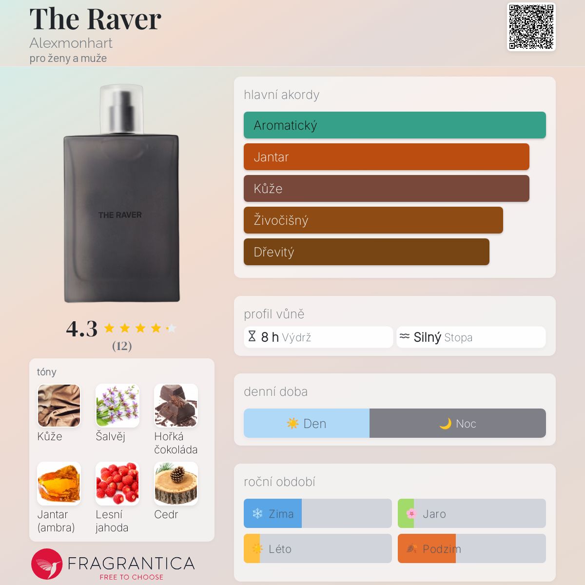 The Raver podle Alexmonhart je vůně pro ženy a muže. Toto je nová vůně. The Raver byl/a uveden/a v roce 2024. Vrchní tóny jsou Šalvěj, Lesní jahoda, Galbanum a Vavříny; střední tóny jsouKůže, Jalovec a Jasmín ; základní tóny jsou Hořká čokoláda, Jantar (ambra), Cedr a Ambra.