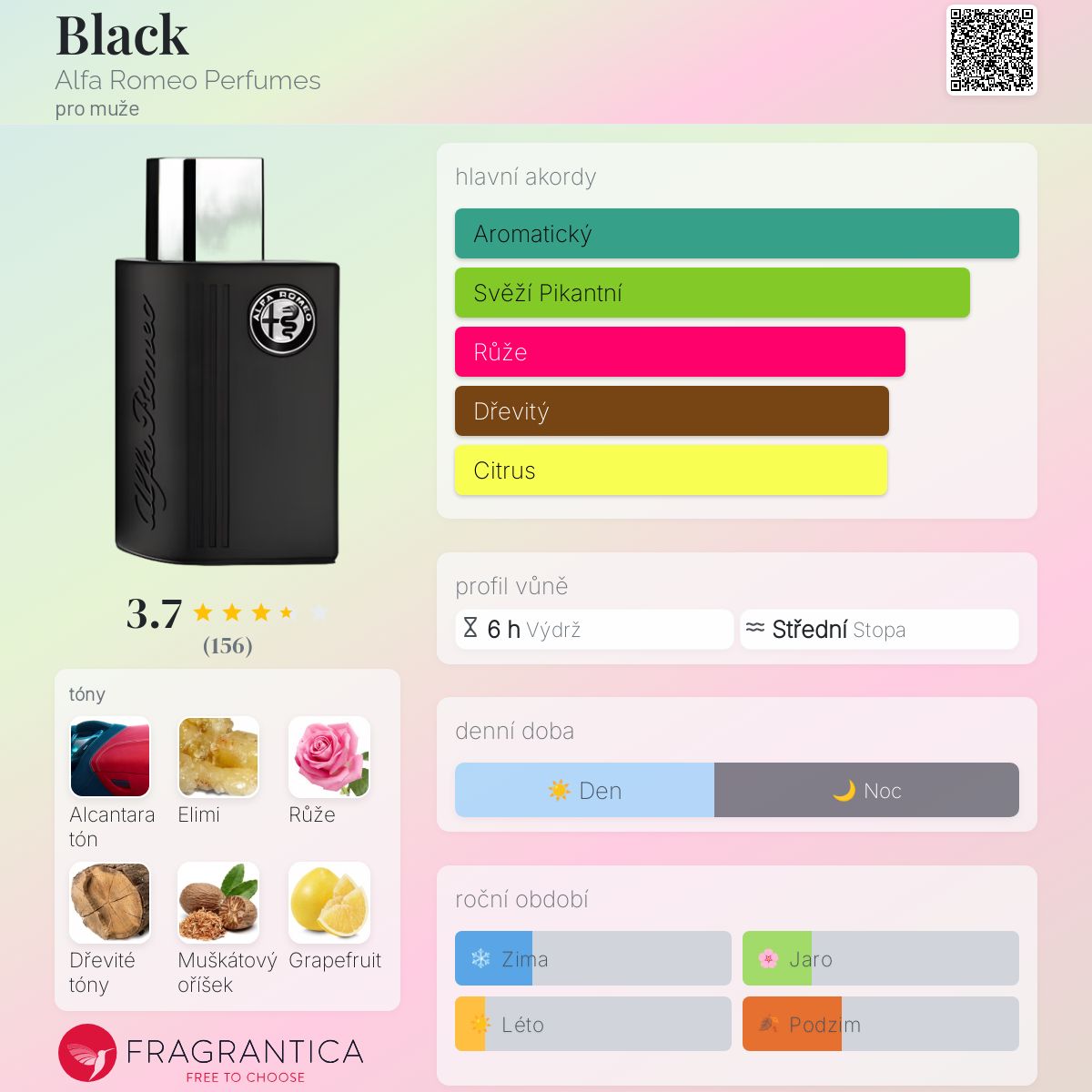 Black podle Alfa Romeo Perfumes je vůně pro muže. Black byl/a uveden/a v roce 2021. "Nosem" za touto vůní je Cristiano Canali. Vrchní tóny jsou Elemi a Grapefruit; střední tóny jsouČerná růže a Muškátový oříšek ; základní tóny jsou Alcantara tón a Temné dřevité tóny.