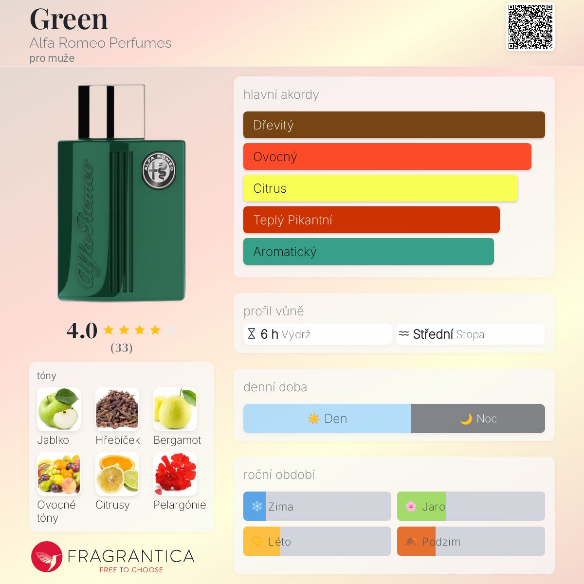 Green podle Alfa Romeo Perfumes je Woody Aromatic vůně pro muže. Green byl/a uveden/a v roce 2024. Vrchní tóny jsou Jablko, Bergamot, Ovoce a Citrusy; střední tóny jsouHřebíček, Pelargónie a Mahagon ; základní tóny jsou Santalové dřevo, Vetiver a Cedr.