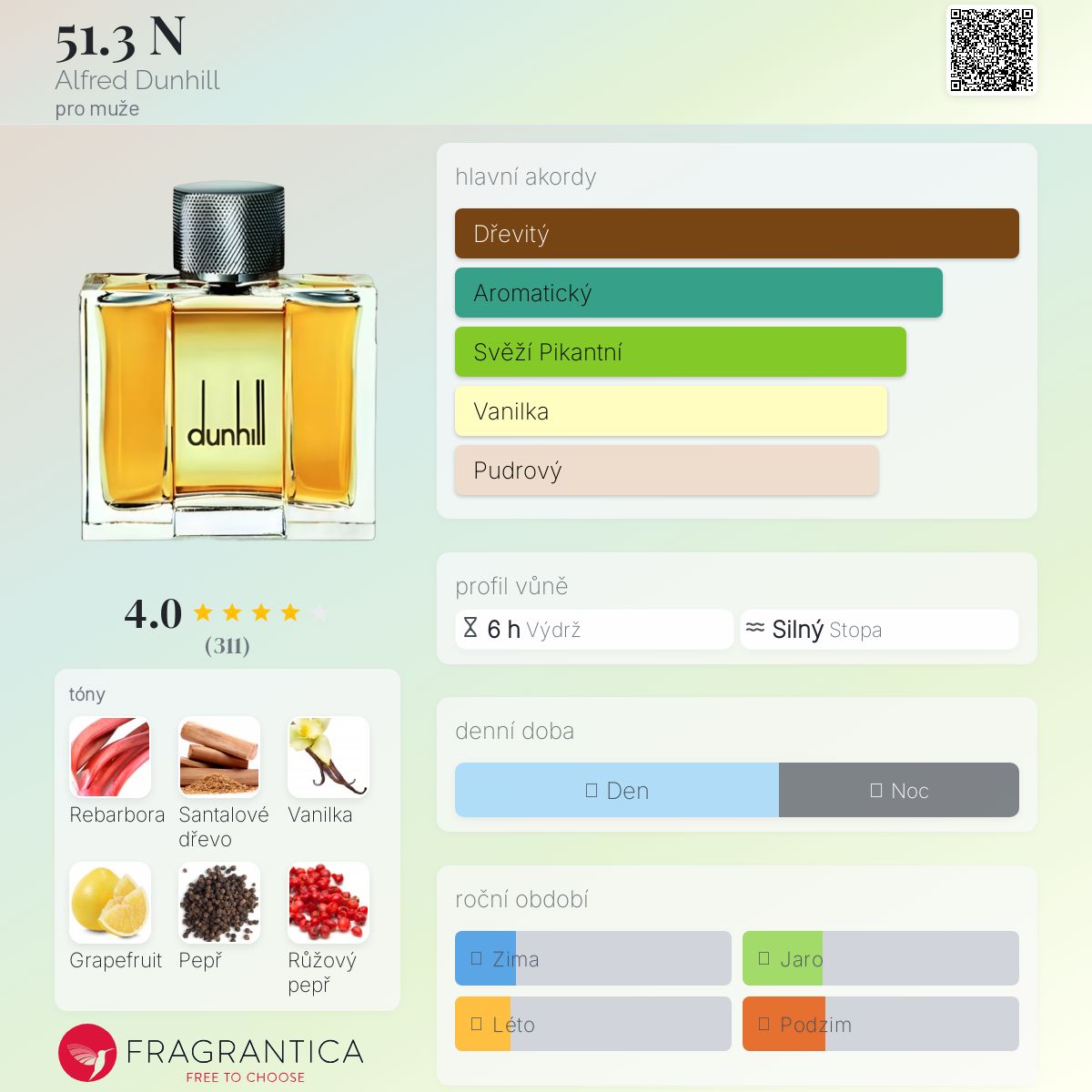 51.3 N podle Alfred Dunhill je Aromatic Spicy vůně pro muže. 51.3 N byl/a uveden/a v roce 2009. Vrchní tóny jsou Rebarbora a Grapefruit; střední tóny jsouPepř, Růžový pepř, Virginský cedr a Levandule ; základní tóny jsou Santalové dřevo a Vanilka.