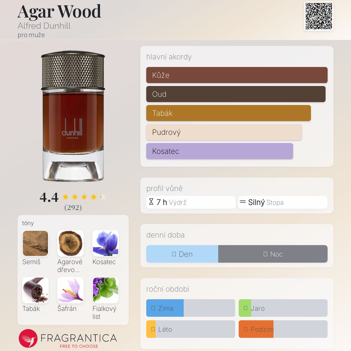 Agar Wood podle Alfred Dunhill je Woody vůně pro muže. Agar Wood byl/a uveden/a v roce 2020. "Nosem" za touto vůní je Gino Percontino. Vrchní tóny jsou Šafrán, Růžový pepř, Zázvor a Bergamot; střední tóny jsouČerná kosatec, Fialkový list a Cypřiš ; základní tóny jsou Semiš, Agarové dřevo (oud), Tabák a Masticha.