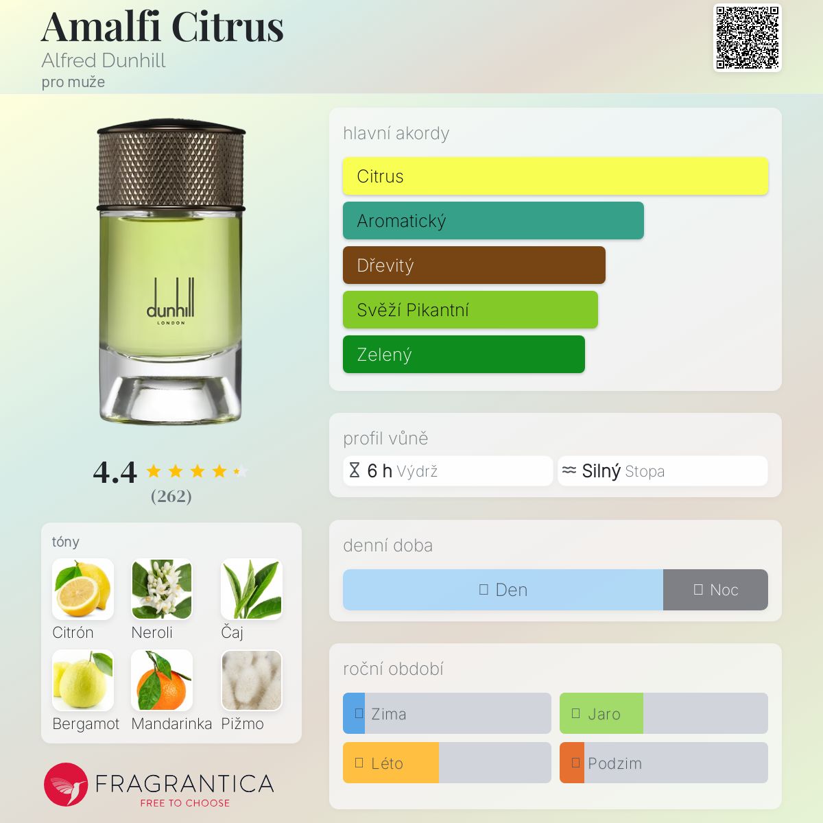 Amalfi Citrus podle Alfred Dunhill je Woody Floral Musk vůně pro muže. Amalfi Citrus byl/a uveden/a v roce 2020. "Nosem" za touto vůní je Olivier Gillotin. Vrchní tóny jsou Citrón, Bergamot, Zelená mandarinka, Mandarinka a Hořký pomeranč; střední tóny jsouNeroli, Zelený čaj, Rozmarýn, Jasmín a Kardamom ; základní tóny jsou Pižmo, Vetiver, Dřevité tóny a Jantar (ambra).