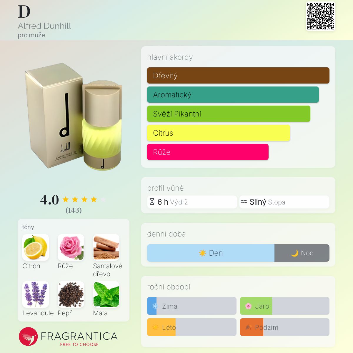 D podle Alfred Dunhill je Aromatic Fougere vůně pro muže. D byl/a uveden/a v roce 1996. "Nosem" za touto vůní je Gerard Anthony. Vrchní tóny jsou Citron amalfi , Pepř, Máta, Mandarinka, Cypřiš a Palisandr; střední tóny jsouRůže, Levandule, Pelargónie, Jasmín, Konvalinka a Frézie ; základní tóny jsou Santalové dřevo, Virginský cedr, Pižmo, Dubový mech, Fazole tonka, Vanilka a Jantar (ambra).