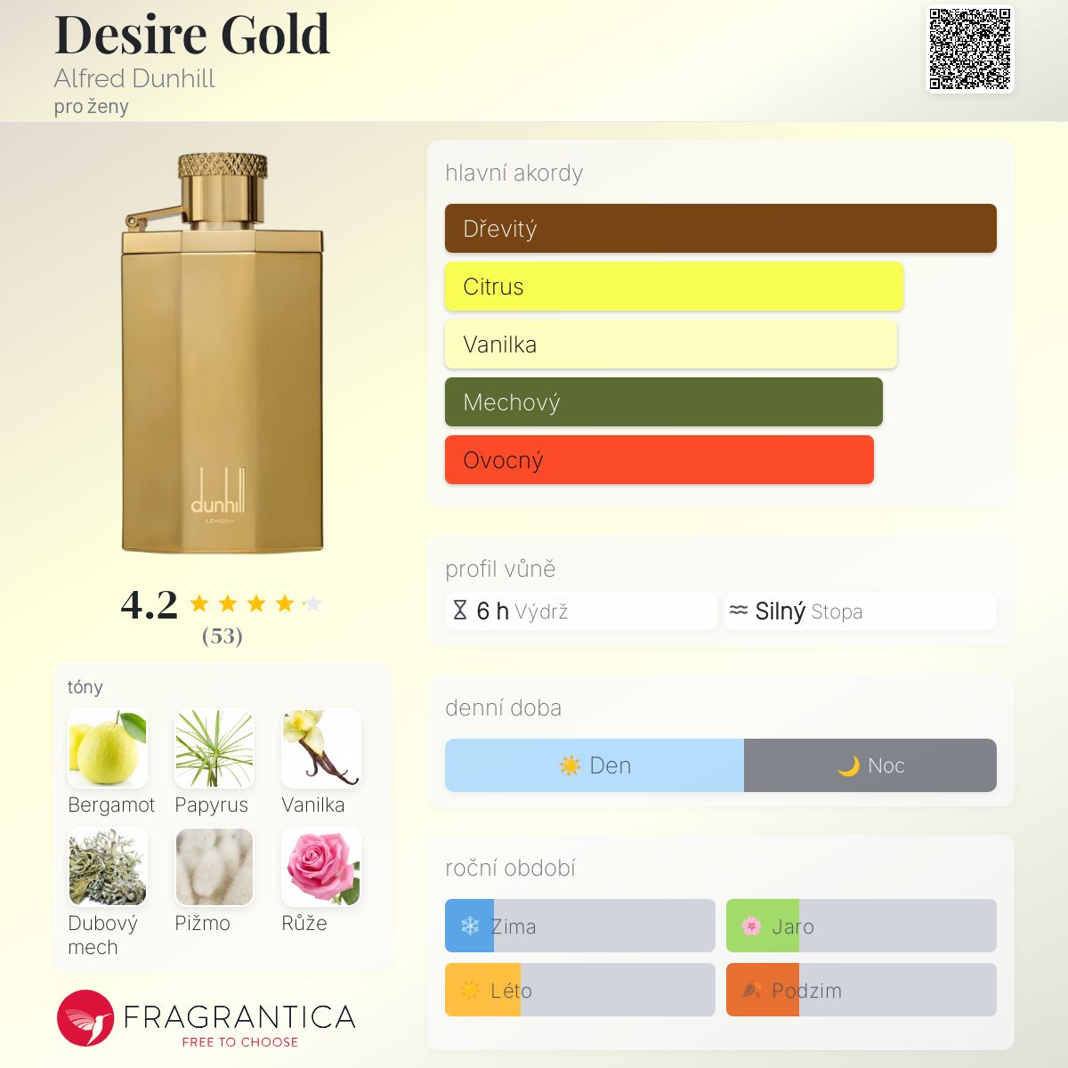 Desire Gold podle Alfred Dunhill je Floral vůně pro ženy. Desire Gold byl/a uveden/a v roce 2020. Vrchní tóny jsou Bergamot, Černý rybíz a Jablko; střední tóny jsouPapyrus a Růže z Grasse ; základní tóny jsou Vanilka, Dubový mech a Pižmo.