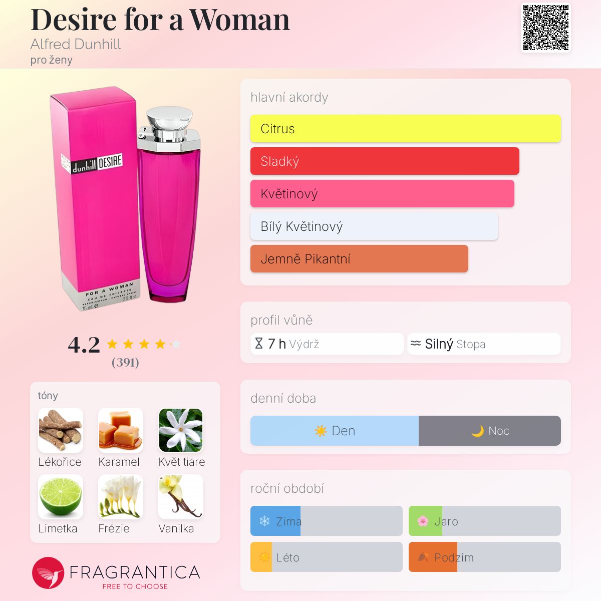 Desire for a Woman podle Alfred Dunhill je Orientální Floral vůně pro ženy. Desire for a Woman byl/a uveden/a v roce 2001. "Nosem" za touto vůní je Maurice Roucel. Vrchní tóny jsou Limetka, Pomeranč, Magnólie, Brazilské růžové dřevo, Bergamot, Zelené listí a Myrta; střední tóny jsouLékořice, Květ tiare, Frézie, Gardénie a Růže ; základní tóny jsou Karamel, Vanilka, Santalové dřevo, Jantar (ambra) a Pižmo.