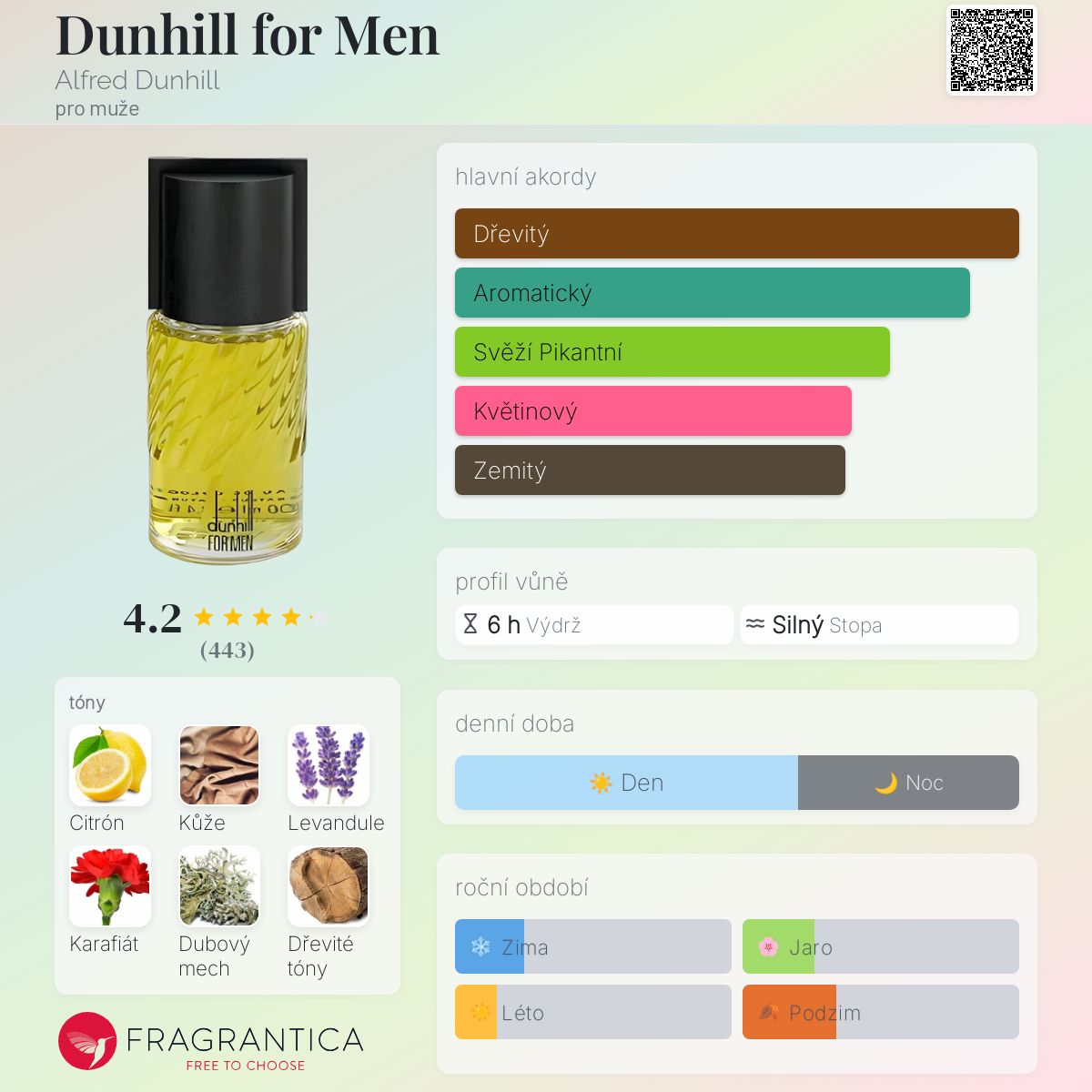 Dunhill for Men podle Alfred Dunhill je Woody Spicy vůně pro muže. Dunhill for Men byl/a uveden/a v roce 1934. Vrchní tóny jsou Citron amalfi , Levandule, Pelargónie a Muškátový oříšek; střední tóny jsouKarafiát, Dřevité tóny, Kosatec, Růže a Jasmín ; základní tóny jsou Kůže, Dubový mech, Vetiver, Santalové dřevo, Virginský cedr a Fazole tonka.