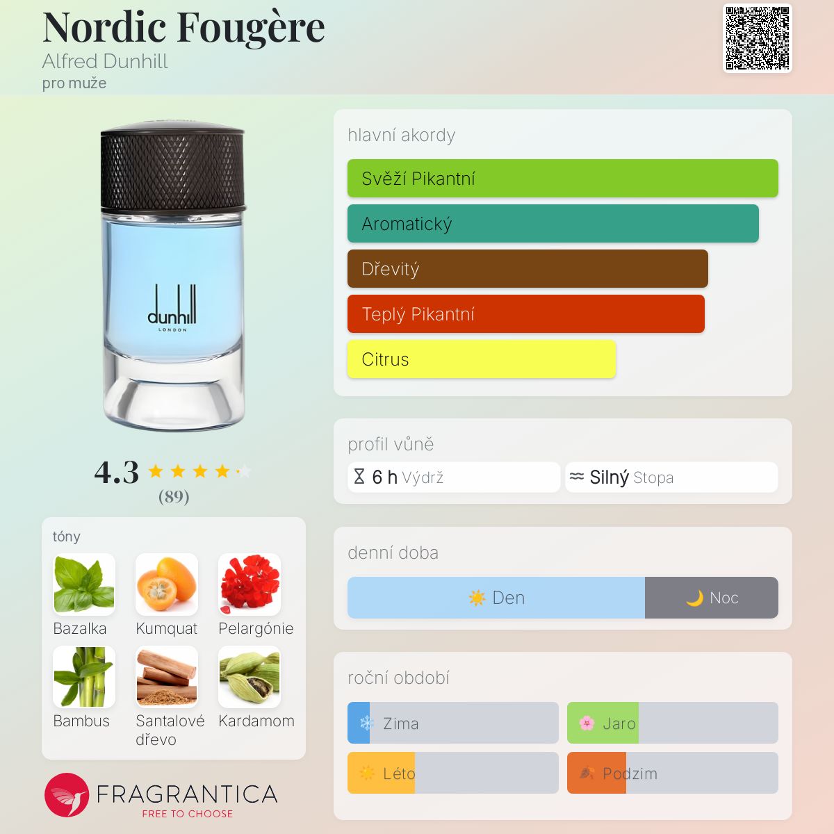 Nordic Fougère podle Alfred Dunhill je Aromatic Fougere vůně pro muže. Nordic Fougère byl/a uveden/a v roce 2022. Nordic Fougère byl/a vytvořen/a Michel Almairac a Jérôme Epinette. Vrchní tóny jsou Bazalka, Kardamom a Černý pepř; střední tóny jsouKumquat, Pelargónie a Bambusový list ; základní tóny jsou Santalové dřevo, Vanilka a Pačuli.