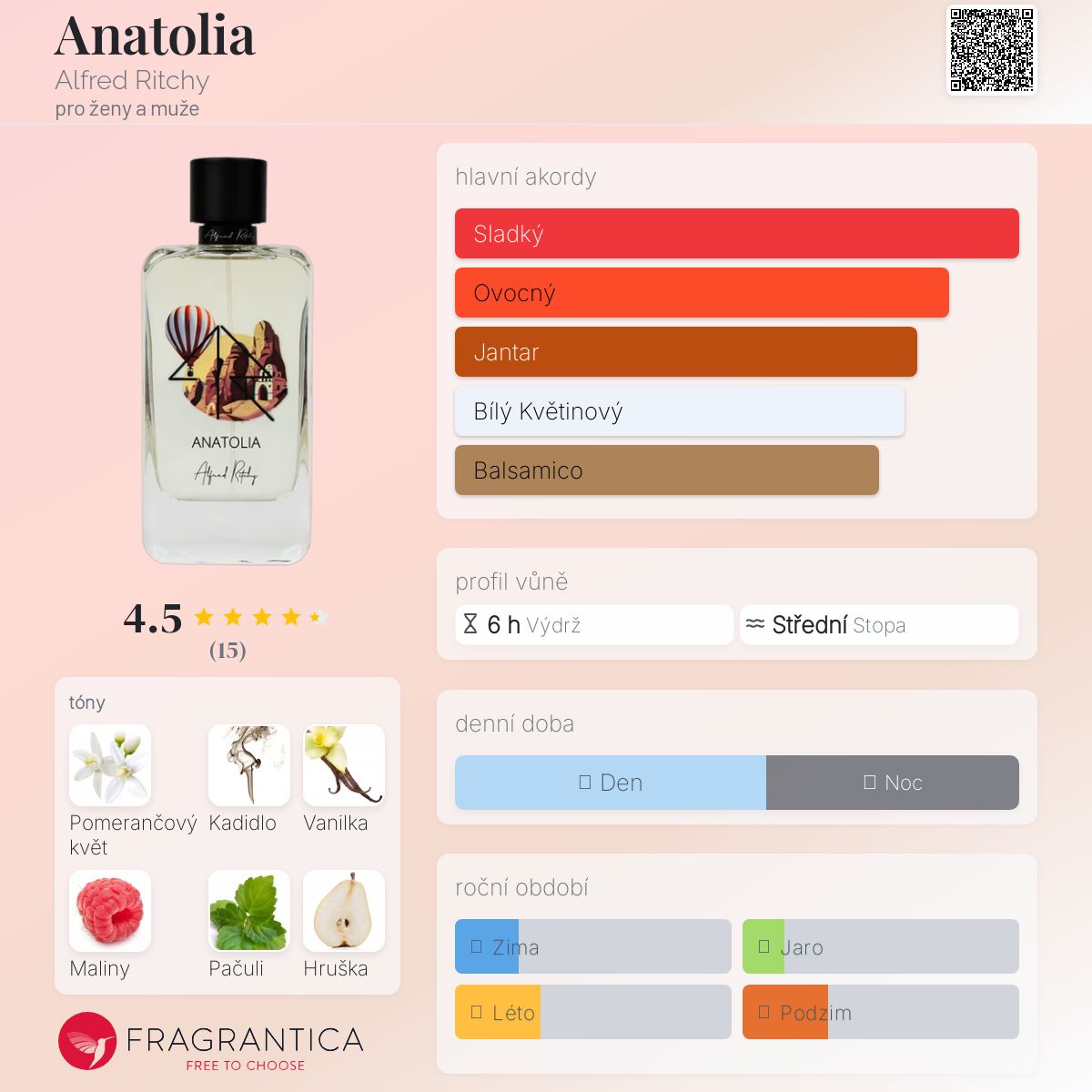 Anatolia podle Alfred Ritchy je Floral Fruity Gourmand vůně pro ženy a muže. Toto je nová vůně. Anatolia byl/a uveden/a v roce 2024. Vrchní tóny jsou Maliny, Hruška a Mandarinka; střední tóny jsouPomerančový květ, Kadidlo, Karamel a Pelargónie ; základní tóny jsou Vanilka, Pačuli, Santalové dřevo a Jantar (ambra).