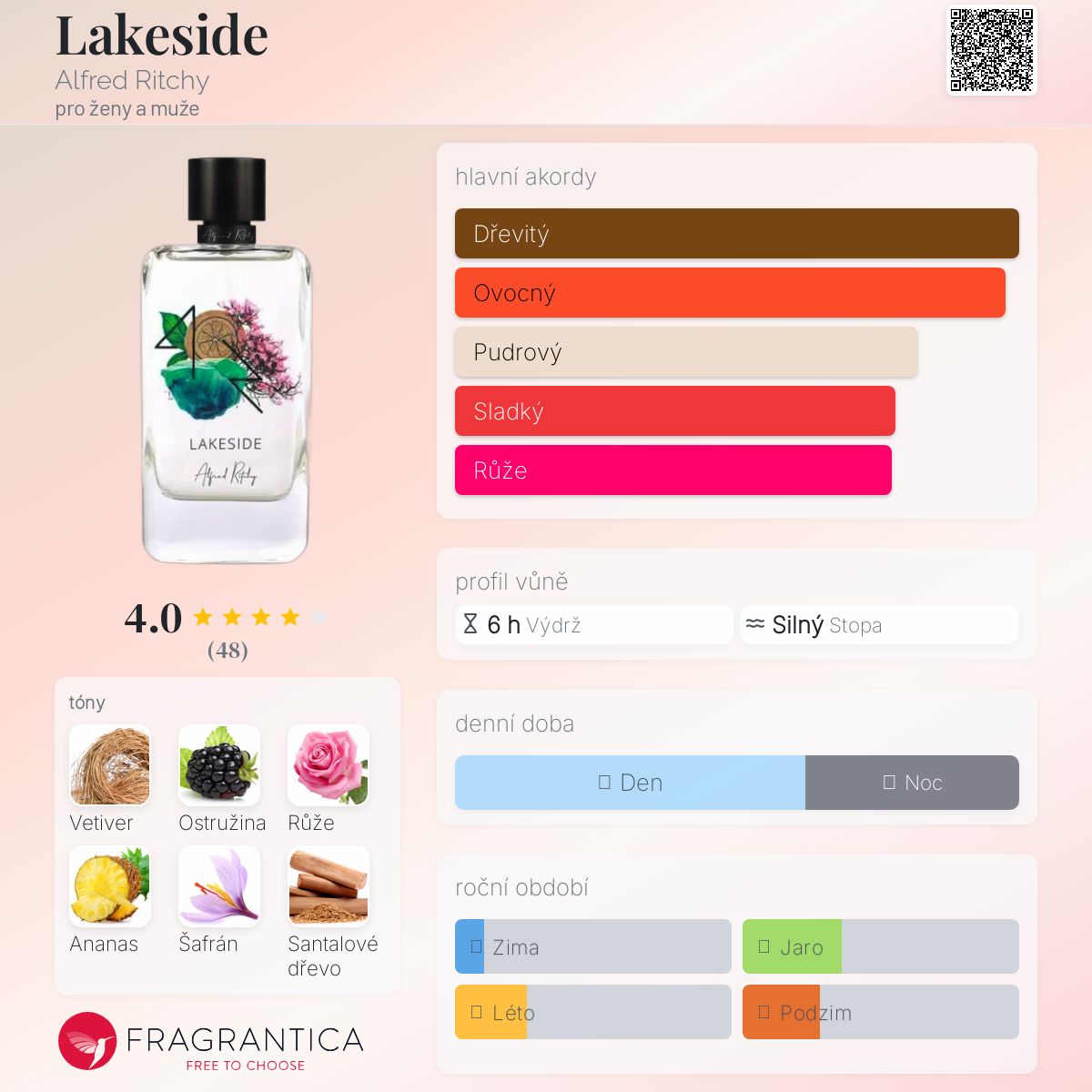 Lakeside podle Alfred Ritchy je Woody Aquatic vůně pro ženy a muže. Lakeside byl/a uveden/a v roce 2022. Vrchní tóny jsou Ostružina, Ananas a Bergamot; střední tóny jsouRůže, Šafrán, Konvalinka a Fialka ; základní tóny jsou Vetiver, Santalové dřevo a Pižmo.
