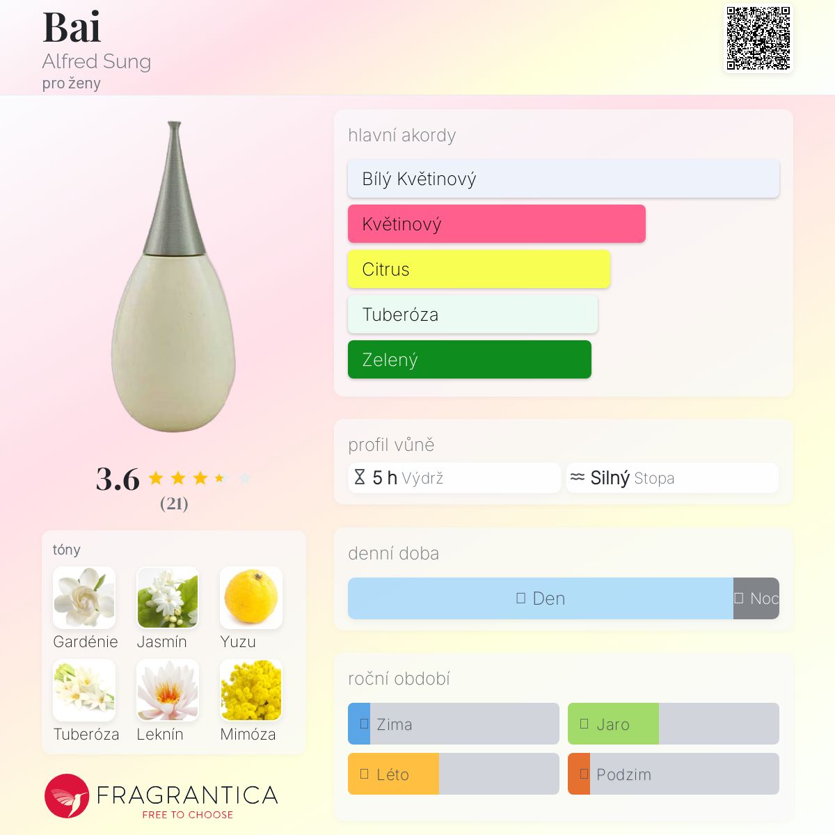 Bai podle Alfred Sung je Floral vůně pro ženy. Bai byl/a uveden/a v roce 2006. Vrchní tóny jsou Yuzu, Tuberóza a Leknín; střední tóny jsouGardénie, Jasmín a Mimóza ; základní tóny jsou Bílé pižmo, Pačuli a Kadidlo.
