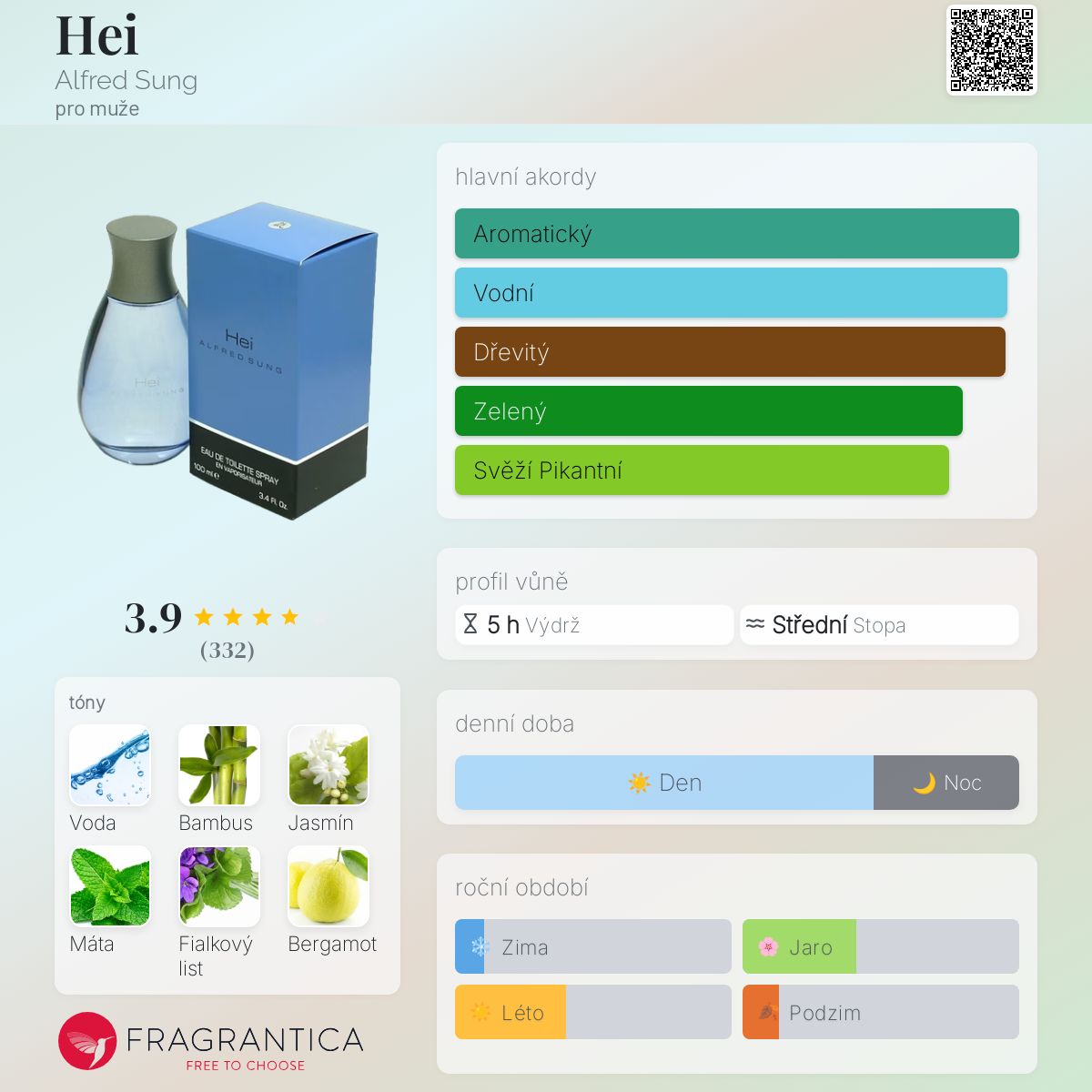 Hei podle Alfred Sung je Aromatic Fougere vůně pro muže. Hei byl/a uveden/a v roce 2002. "Nosem" za touto vůní je David Apel. Vrchní tóny jsou Bambus, Máta, Fialkový list a Bergamot; střední tóny jsouVodní tóny, Jasmín, Levandule, Neroli, Fenykl, Kardamom a Kopr ; základní tóny jsou Pižmo, Mahagon, Fazole tonka, Jantar (ambra) a Cedr.