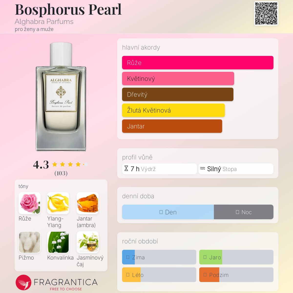 Bosphorus Pearl podle Alghabra Parfums je Orientální Floral vůně pro ženy a muže. Bosphorus Pearl byl/a uveden/a v roce 2019. Vrchní tóny jsou Růže, Konvalinka a Fialka; střední tóny jsouYlang-Ylang, Jasmínový čaj a Cedr ; základní tóny jsou Jantar (ambra), Bílé pižmo a Suché dřevo.
