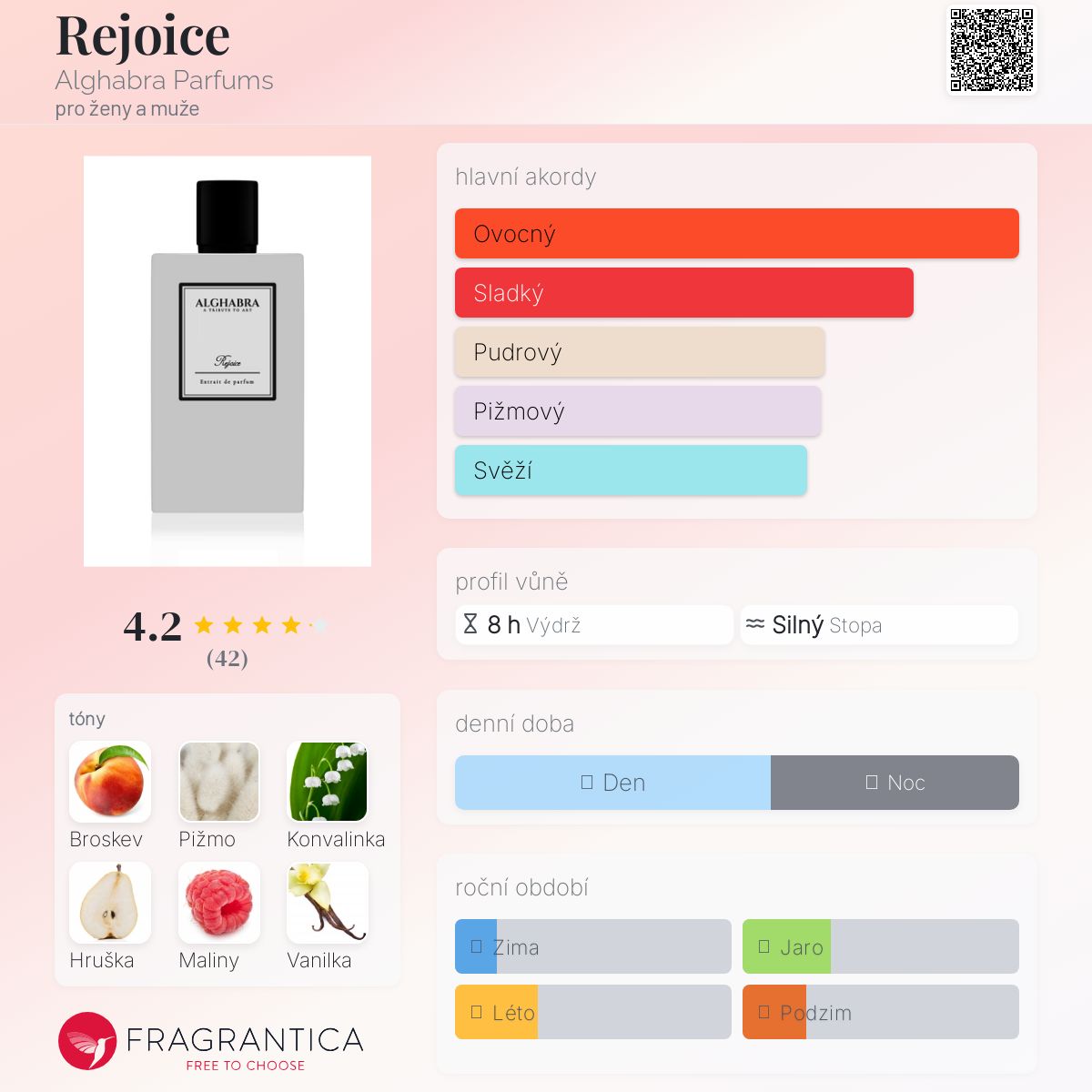 Rejoice podle Alghabra Parfums je vůně pro ženy a muže. Rejoice byl/a uveden/a v roce 2023. Vrchní tóny jsou Broskev, Hruška a Mučenka; střední tóny jsouKonvalinka a Maliny ; základní tóny jsou Pižmo, Vanilka a Santalové dřevo.