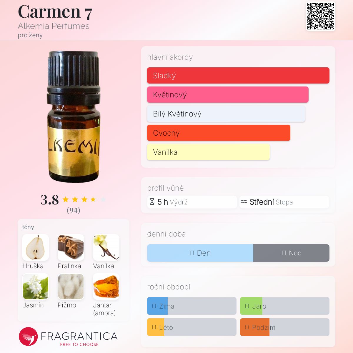 Carmen 7 podle Alkemia Perfumes je Floral Fruity Gourmand vůně pro ženy. Carmen 7 byl/a uveden/a v roce 2014. "Nosem" za touto vůní je Sharra Lamoureaux. Vrchní tóny jsou Hruška, Pralinka, Bourbonská vanilka, Mandlový květ , Liči a Kořeněné tóny; střední tóny jsouJasmín mnohokvětý, Magnólie a Gardénie ; základní tóny jsou Pižmo a Jantar (ambra).