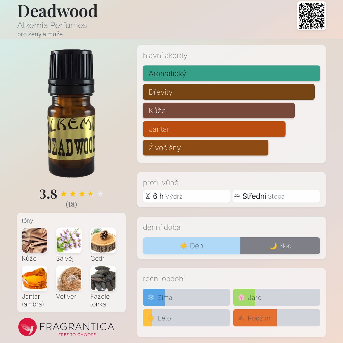 Deadwood podle Alkemia Perfumes je vůně pro ženy a muže. Deadwood byl/a uveden/a v roce 2015. "Nosem" za touto vůní je Sharra Lamoureaux.