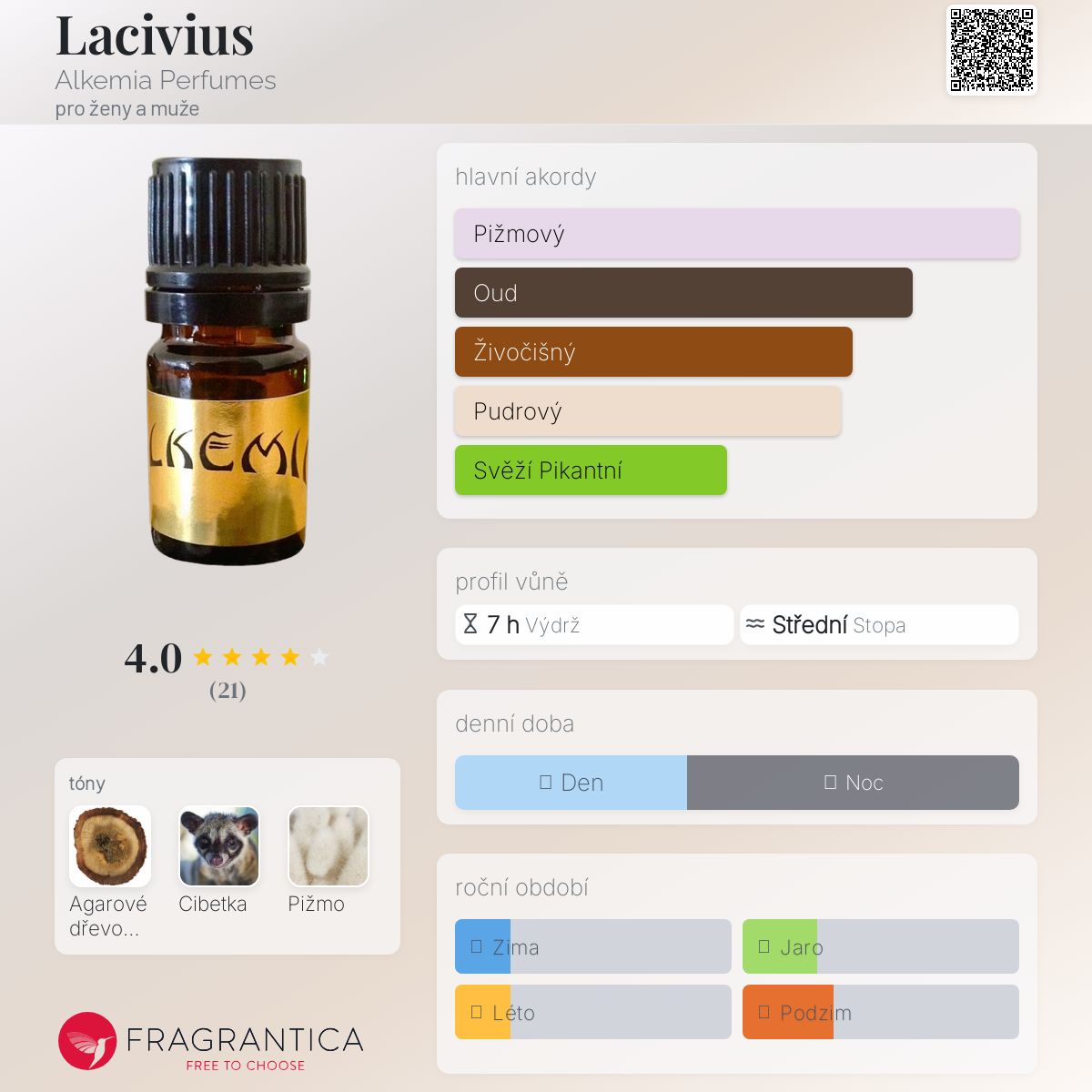 Lacivius podle Alkemia Perfumes je Orientální Woody vůně pro ženy a muže. Lacivius byl/a uveden/a v roce 2011. "Nosem" za touto vůní je Sharra Lamoureaux.