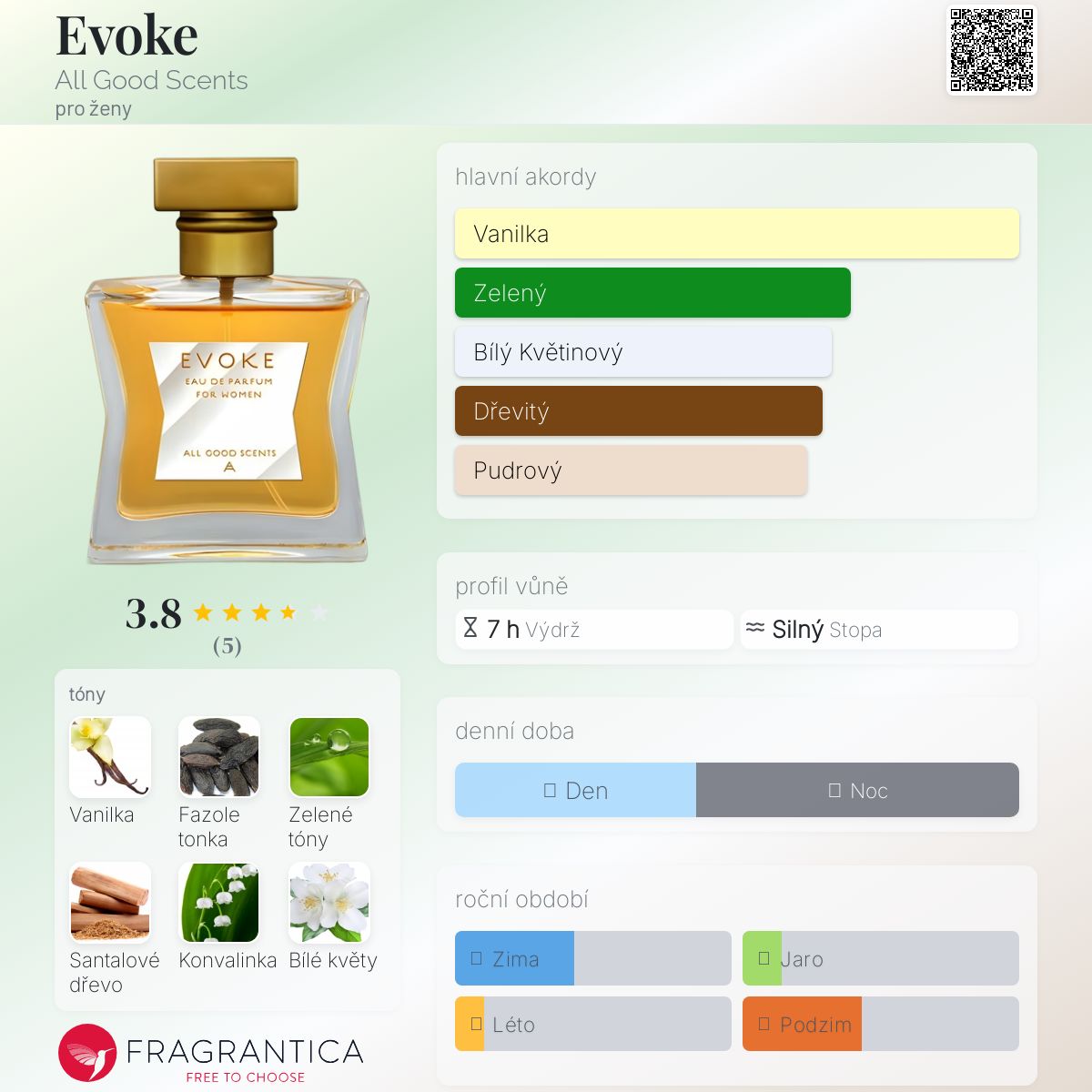 Evoke podle All Good Scents je Floral Woody Musk vůně pro ženy. Evoke byl/a uveden/a v roce 2014. "Nosem" za touto vůní je Rajiv Sheth. Vrchní tóny jsou Zelené tóny, Černý rybíz a Bergamot; střední tóny jsouKonvalinka, Bílé květy a Jasmín ; základní tóny jsou Vanilka, Fazole tonka a Santalové dřevo.