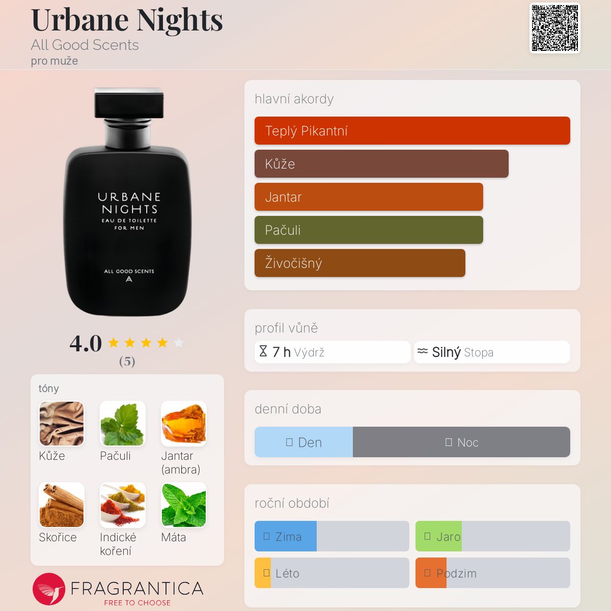 Urbane Nights podle All Good Scents je Orientální Spicy vůně pro muže. Urbane Nights byl/a uveden/a v roce 2014. "Nosem" za touto vůní je Rajiv Sheth. Vrchní tóny jsou Pikantní máta, Grapefruit a Mandarinka; střední tóny jsouSkořice, Indické koření a Růže ; základní tóny jsou Kůže, Pačuli a Jantar (ambra).