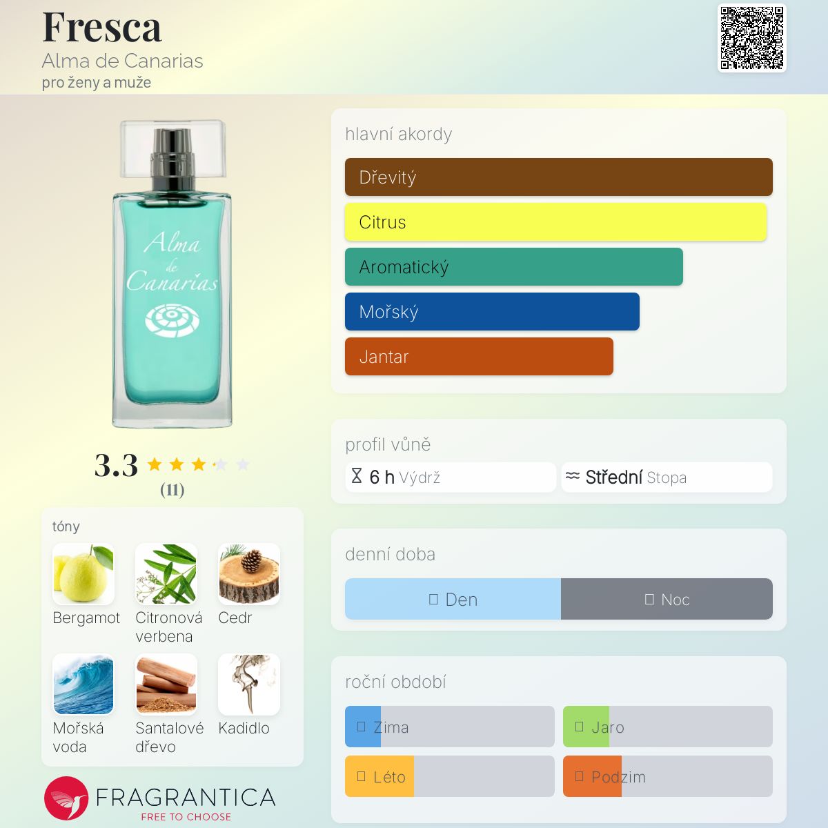 Fresca podle Alma de Canarias je vůně pro ženy a muže. Vrchní tóny jsou Bergamot a Citronová verbena; střední tóny jsouCedr a Mořské tóny ; základní tóny jsou Santalové dřevo a Kadidlo.