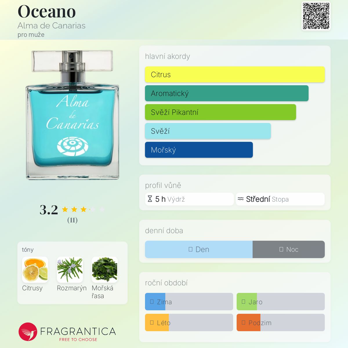 Oceano podle Alma de Canarias je vůně pro muže. Vrchní tón je Citrusy ; střední tón jeRozmarýn ; základní tón je Mořská řasa.