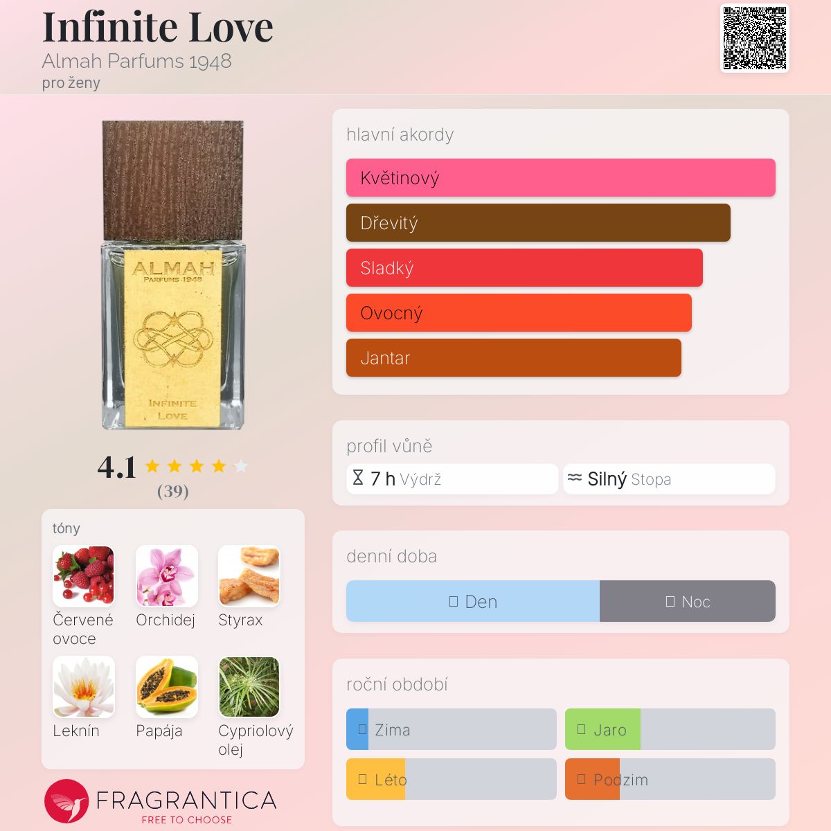 Infinite Love podle Almah Parfums 1948 je vůně pro ženy. Infinite Love byl/a uveden/a v roce 2019. "Nosem" za touto vůní je Jordi Magrans. Vrchní tóny jsou Divoká orchidej, Gardénie a Jasmín; střední tóny jsouČervené ovoce, Leknín, Papája a Cypriolový olej ; základní tóny jsou Styrax, Hřebíček a Vetiver.