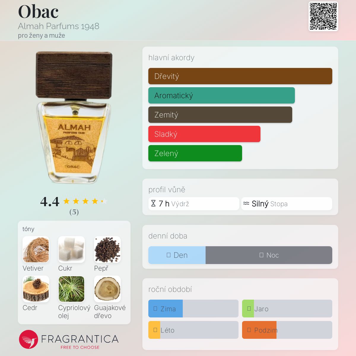 Obac podle Almah Parfums 1948 je Orientální Woody vůně pro ženy a muže. Toto je nová vůně. Obac byl/a uveden/a v roce 2024. "Nosem" za touto vůní je Jordi Magrans.