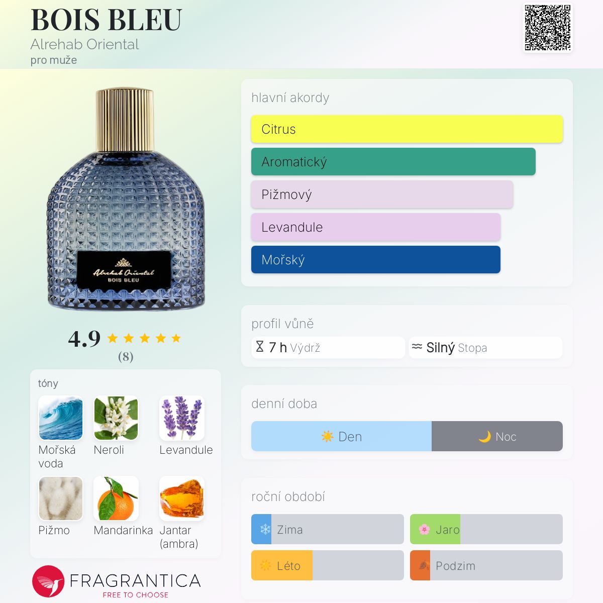 BOIS BLEU podle Alrehab Oriental je Aromatic Fougere vůně pro muže. BOIS BLEU byl/a uveden/a v roce 2020. Vrchní tóny jsou Mandarinka, Bergamot, Růžový pepř a Citrón; střední tóny jsouMořské tóny, Neroli a Levandule ; základní tóny jsou Pižmo, Jantar (ambra), Cedr a Vetiver.