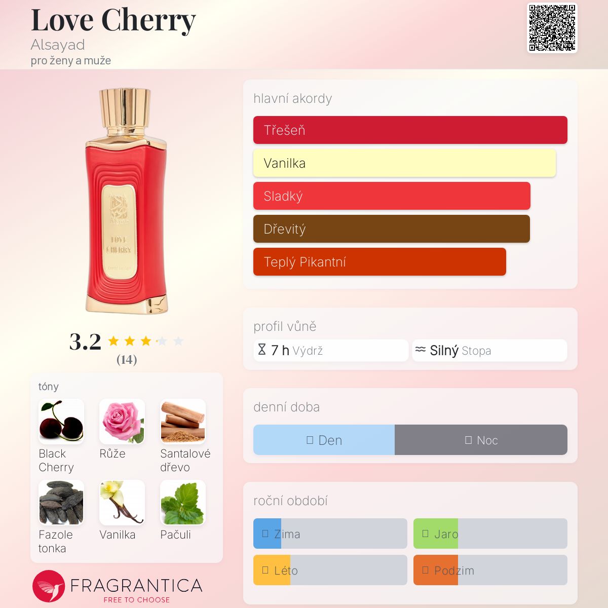Love Cherry podle Alsayad je vůně pro ženy a muže. Love Cherry byl/a uveden/a v roce 2023. "Nosem" za touto vůní je Ahmed Al Saiad. Vrchní tóny jsou Černá třešeň a Mandle; střední tóny jsouDamašská růže, Kyselá třešeň, Jasmín a Sušené švestky ; základní tóny jsou Santalové dřevo, Fazole tonka, Vanilka, Pačuli, Benzoin a Skořice.