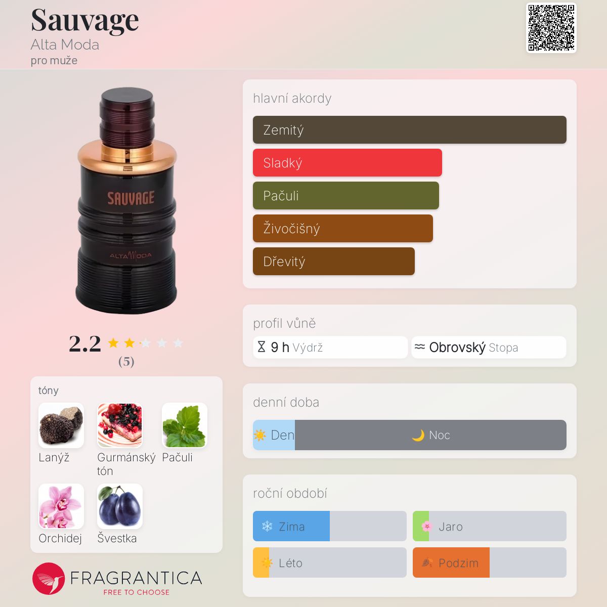 Sauvage podle Alta Moda je Woody Aromatic vůně pro muže. Sauvage byl/a uveden/a v roce 2019. Vrchní tóny jsou Lanýž a Černá orchidej; střední tóny jsouGurmánský tón a Švestka ; základní tón je Pačuli.