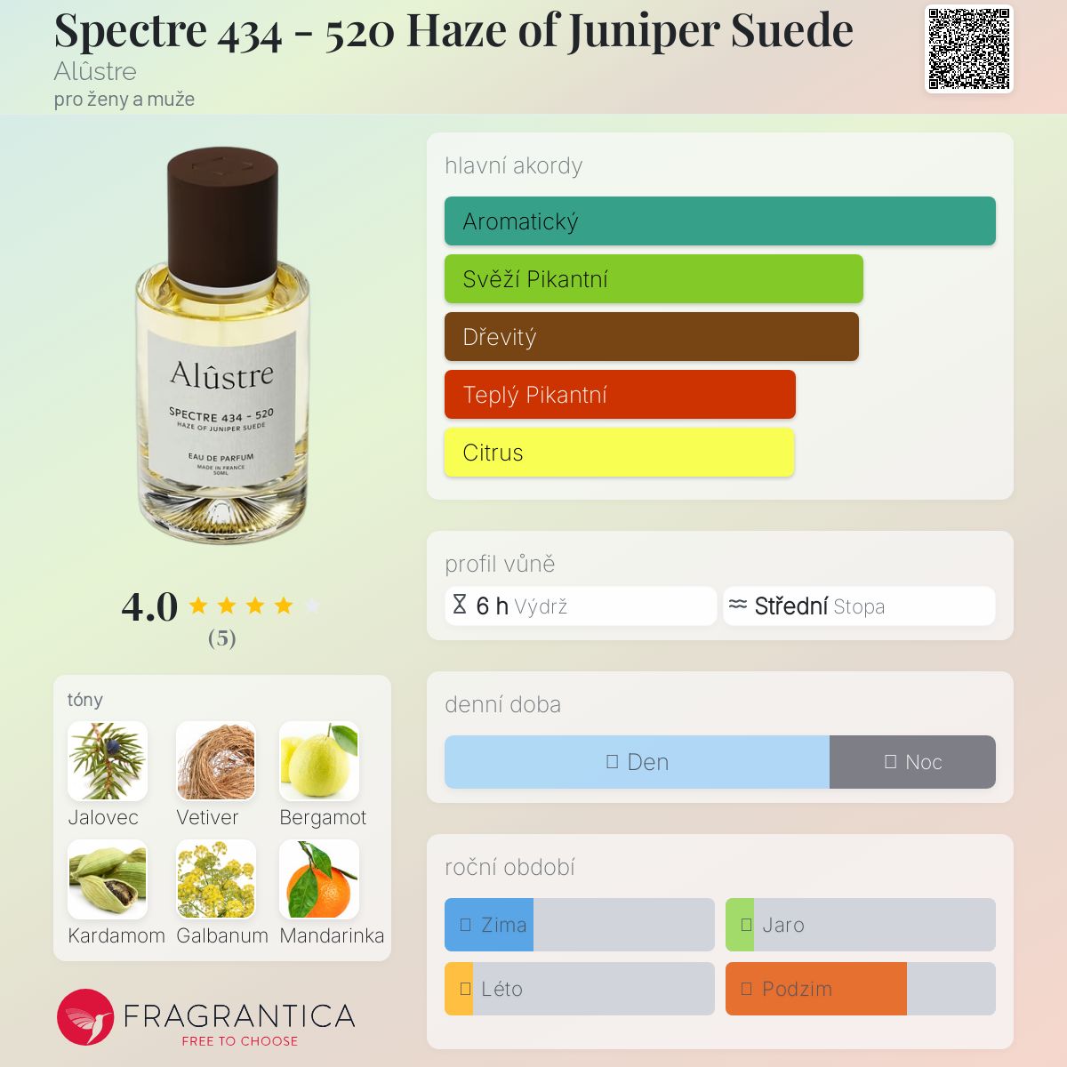 Spectre 434 - 520 Haze of Juniper Suede podle Alûstre je Woody vůně pro ženy a muže. Toto je nová vůně. Spectre 434 - 520 Haze of Juniper Suede byl/a uveden/a v roce 2024. "Nosem" za touto vůní je Bertrand Duchaufour. Vrchní tóny jsou Bergamot, Kardamom, Galbanum, Mandarinka a Pomelo; střední tóny jsouJalovec, Černý pepř, Karafiát, Skořice, Mahagon, Tymián a Růže ; základní tóny jsou Vetiver, Bílé pižmo, Ambra, Dubový mech a Fazole tonka.