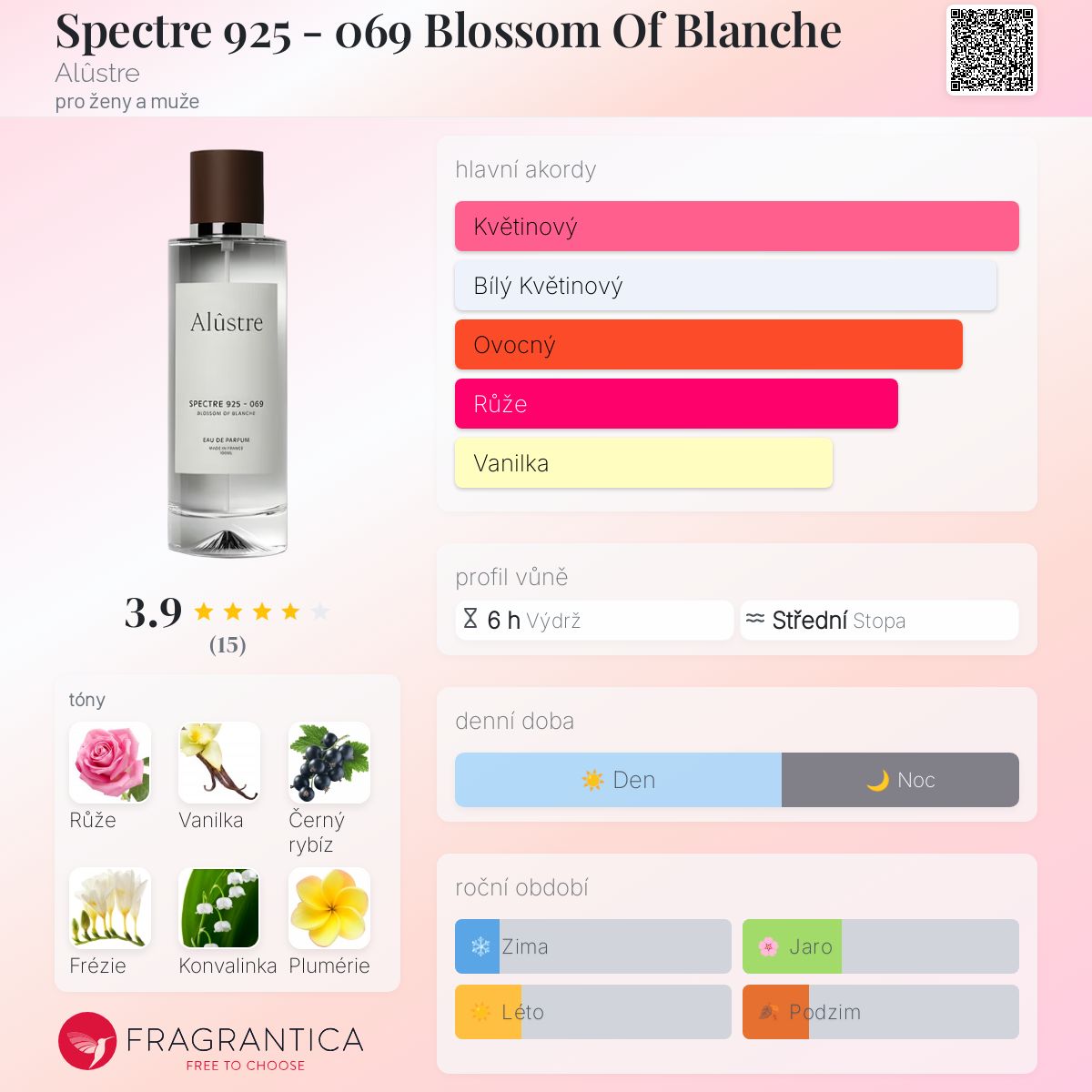 Spectre 925 - 069 Blossom Of Blanche podle Alûstre je vůně pro ženy a muže. Spectre 925 - 069 Blossom Of Blanche byl/a uveden/a v roce 2023. "Nosem" za touto vůní je Bertrand Duchaufour. Vrchní tóny jsou Černý rybíz, Borůvky a Červené ovoce; střední tóny jsouRůže, Frézie, Konvalinka, Plumérie, Tuberóza, Jasmín, Gardénie a Broskev ; základní tóny jsou Vanilka, Mléčná čokoláda, Bílé dřevo, Santalové dřevo, Bílé pižmo a Ambra.