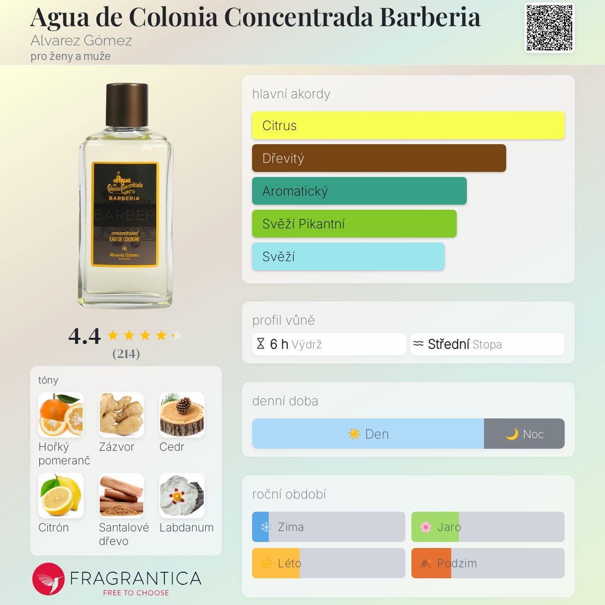 Agua de Colonia Concentrada Barberia podle Alvarez Gómez je Citrus Aromatic vůně pro ženy a muže. Agua de Colonia Concentrada Barberia byl/a uveden/a v roce 2012. Vrchní tóny jsou Hořký pomeranč, Zázvor, Citrón a Bergamot; střední tóny jsouLabdanum, Rebarbora a Koriandr ; základní tóny jsou Cedr, Santalové dřevo a Bílé pižmo.