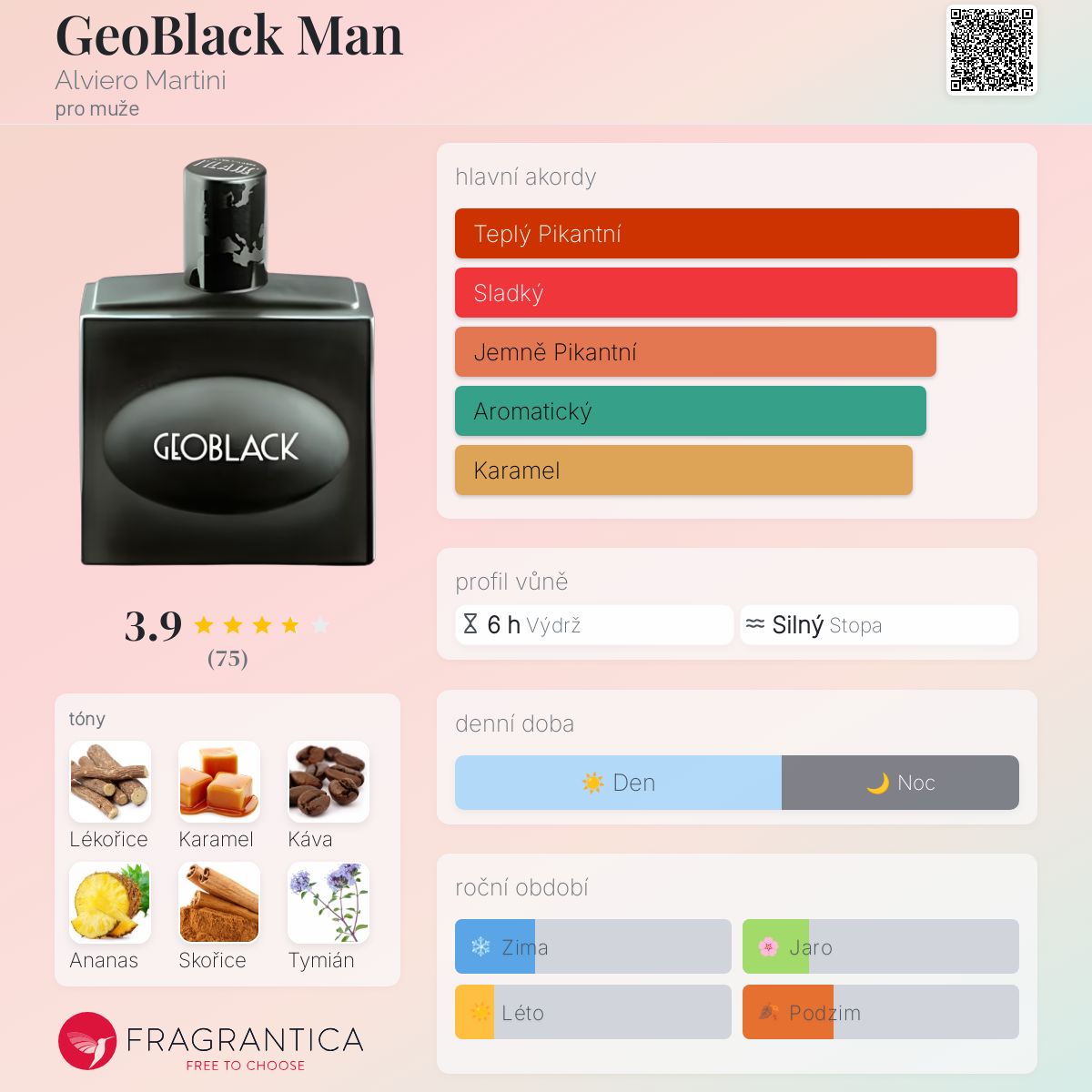 GeoBlack Man podle Alviero Martini je Orientální Fougere vůně pro muže. GeoBlack Man byl/a uveden/a v roce 2007. Vrchní tóny jsou Ananas, Skořice a Tymián; střední tóny jsouLékořice, Kardamom a Levandule ; základní tóny jsou Karamel, Káva, Pižmo a Cedr.