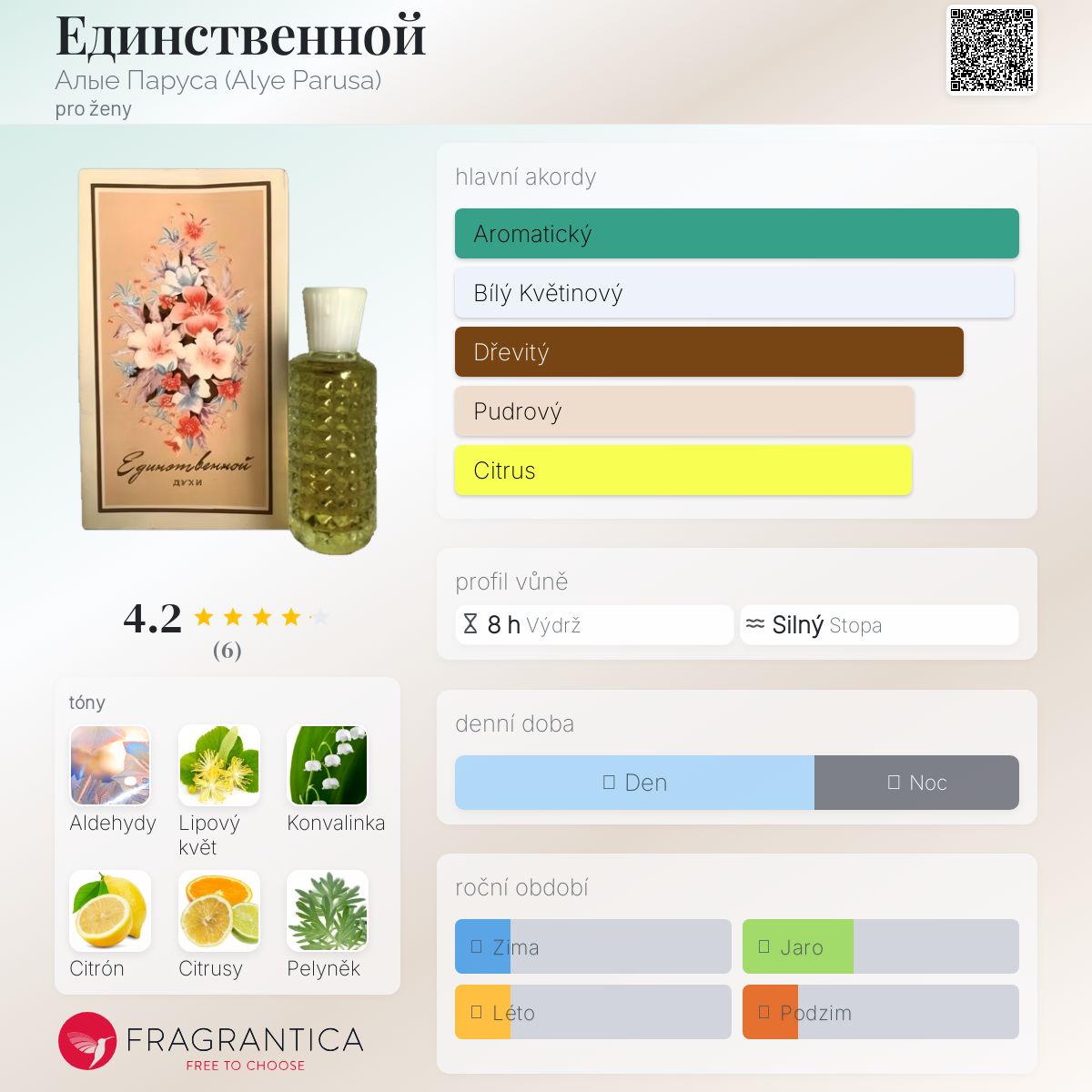 Единственной podle Алые Паруса (Alye Parusa) je Floral Green vůně pro ženy. Единственной byl/a uveden/a v roce 1980. Единственной byl/a vytvořen/a Raisa Moroz, Victoriya Rudyavskaya, Vitaly Plyusnin a Antonina Prohorenko. Vrchní tóny jsou Aldehydy, Lipový květ, Konvalinka, Citrón, Citrusy, Pelyněk a Eukalyptus; střední tóny jsouJasmín, Gardénie, Pelargónie, Levandule, Kumarin, Tabák, Kosatec a Otočník ; základní tóny jsou Dřevité tóny, Pižmo a Ambra.