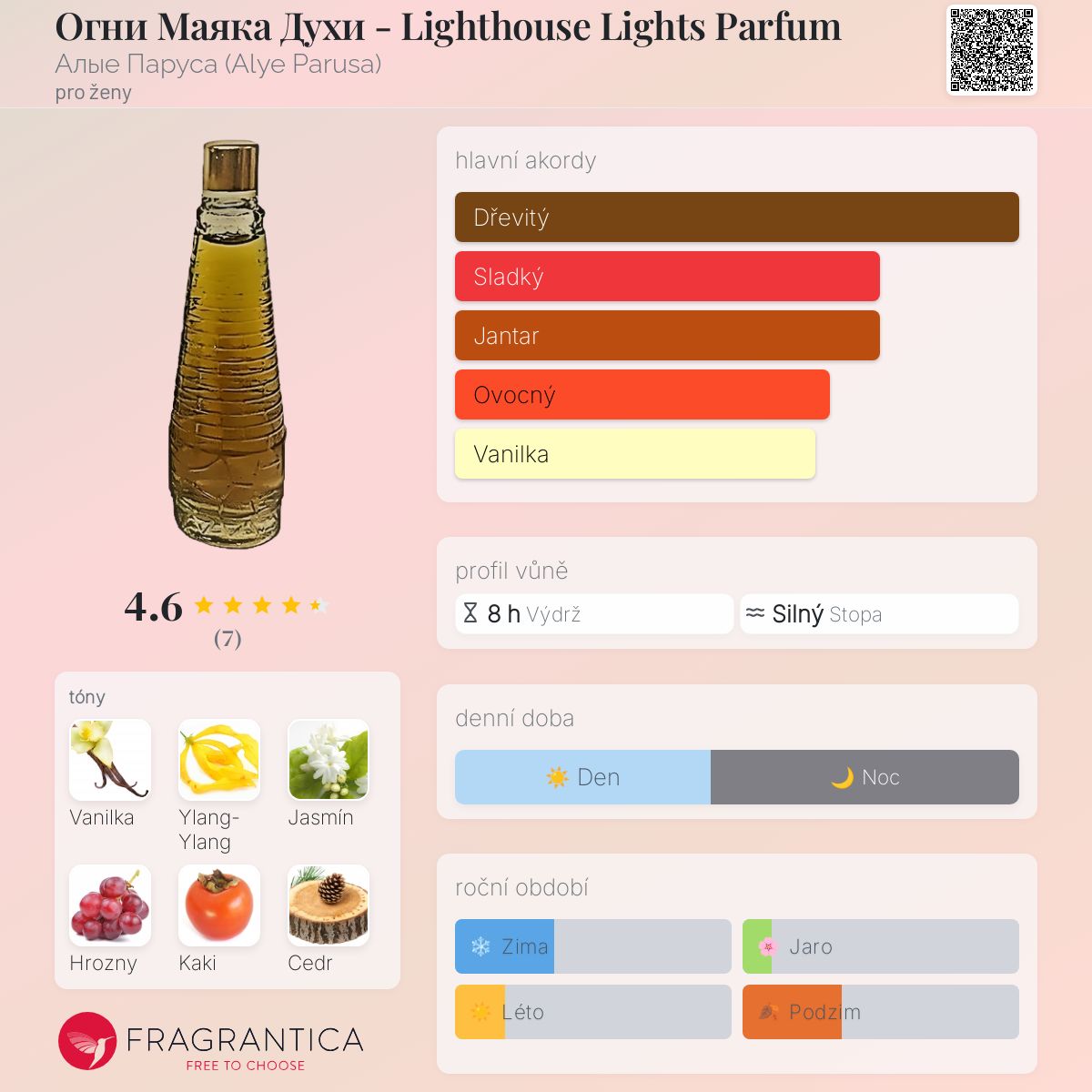 Огни Маяка Духи - Lighthouse Lights Parfum podle Алые Паруса (Alye Parusa) je Orientální Floral vůně pro ženy. Огни Маяка Духи - Lighthouse Lights Parfum byla spuštěna během 1960. "Nosem" za touto vůní je Artyushkova M.L.. Vrchní tóny jsou Vanilka, Ylang-Ylang, Jasmín, Rozinka a Kaki; střední tóny jsouCedr, Vetiver a Benzoin ; základní tóny jsou Suché dřevo, Mech a Jantar (ambra).