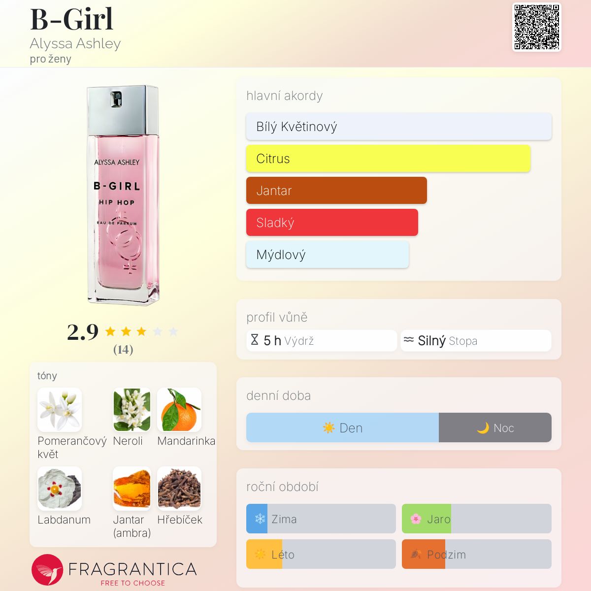 B-Girl podle Alyssa Ashley je Floral vůně pro ženy. B-Girl byl/a uveden/a v roce 2015. Vrchní tóny jsou Neroli, Mandarinka a Hřebíček; střední tóny jsouPomerančový květ, Jasmín Sambac a Damašská růže ; základní tóny jsou Labdanum, Jantar (ambra), Santalové dřevo a Pižmo.