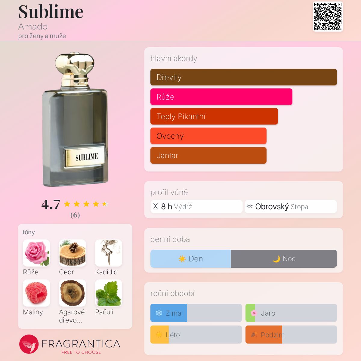 Sublime podle Amado je Woody Floral Musk vůně pro ženy a muže. Sublime byl/a uveden/a v roce 2017. "Nosem" za touto vůní je Christian Provenzano. Vrchní tóny jsou Turecká růže, Maliny, Broskev a Šafrán; střední tóny jsouMarocká růže, Kadidlo a Hedione ; základní tóny jsou Cedr, Agarové dřevo (oud), Pačuli, Cypriolový olej, Santalové dřevo, Vanilka a Pižmo.