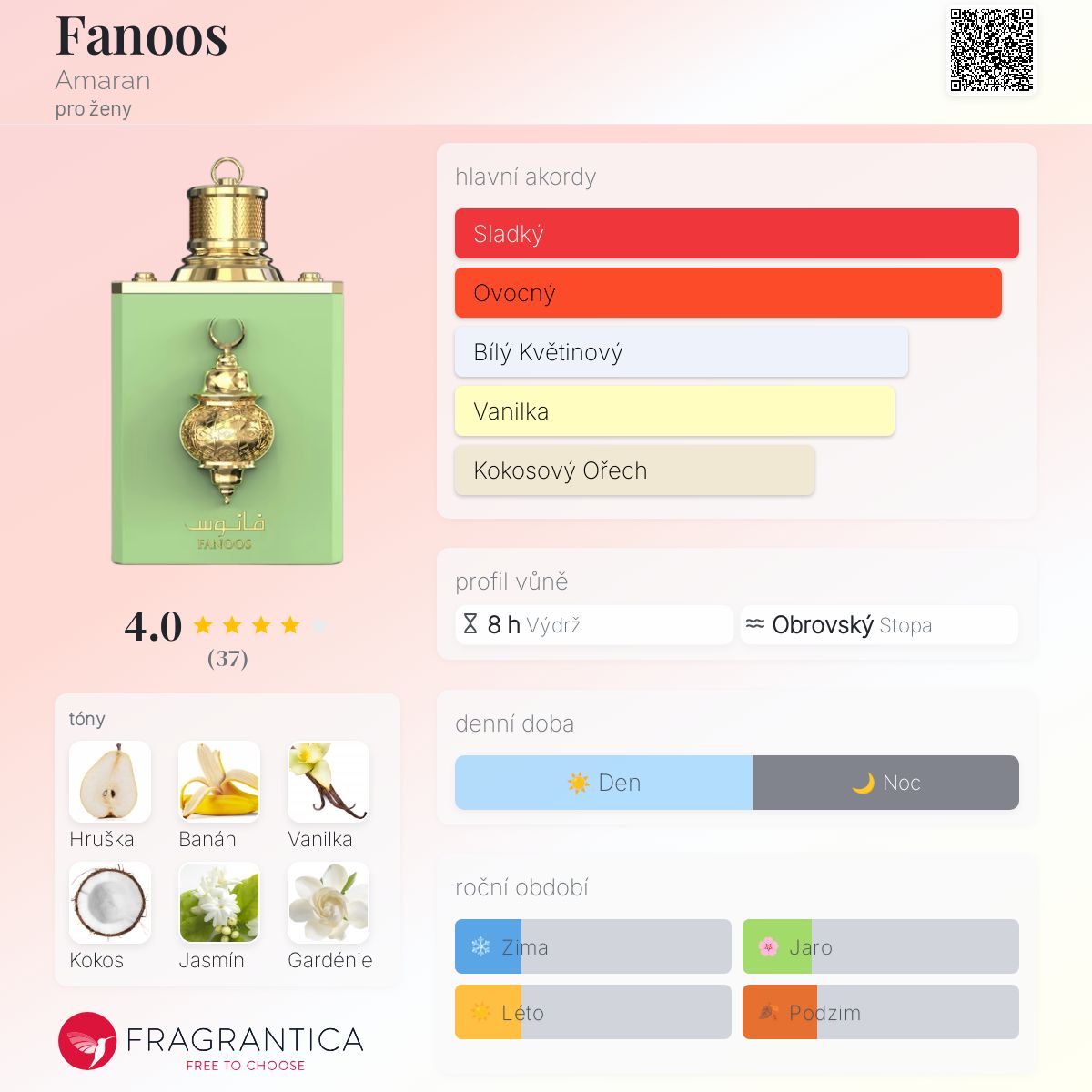Fanoos podle Amaran je Floral Fruity vůně pro ženy. Toto je nová vůně. Fanoos byl/a uveden/a v roce 2025. Vrchní tóny jsou Hruška a Banán; střední tóny jsouKokos, Jasmín a Gardénie ; základní tóny jsou Vanilka, Pižmo a Santalové dřevo.