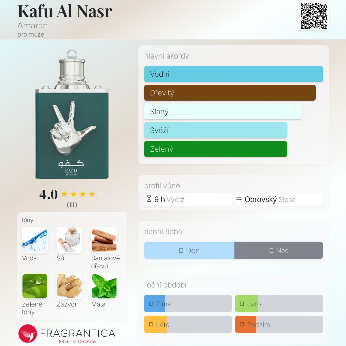 Kafu Al Nasr podle Amaran je Woody Floral Musk vůně pro muže. Toto je nová vůně. Kafu Al Nasr byl/a uveden/a v roce 2025. Vrchní tóny jsou Vodnaté tóny, Zelené tóny, Zázvor a Máta; střední tóny jsouSůl, Grapefruit, Kokos a Fík ; základní tóny jsou Santalové dřevo a Fazole tonka.