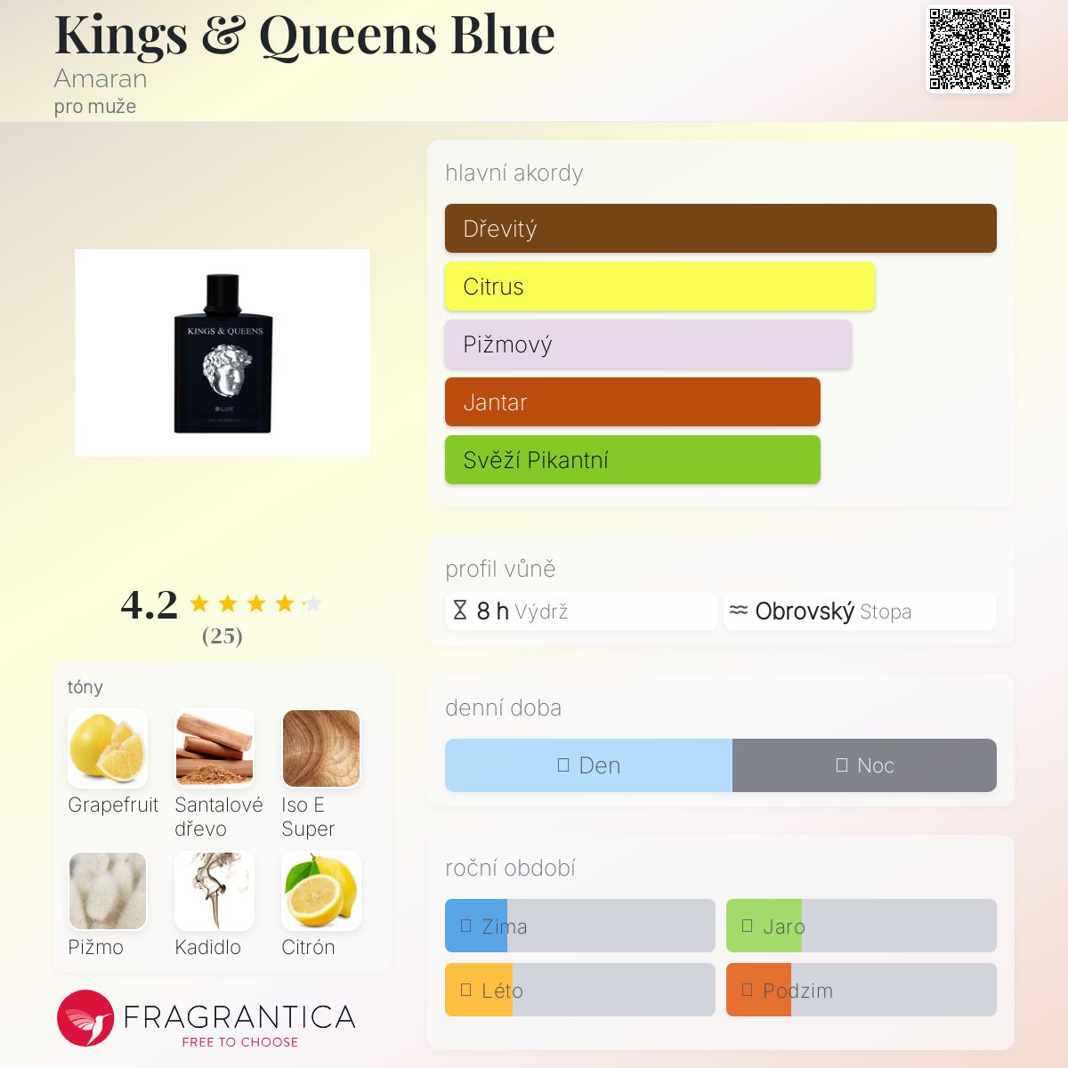 Kings & Queens Blue podle Amaran je Woody Spicy vůně pro muže. Kings & Queens Blue byl/a uveden/a v roce 2021. Vrchní tóny jsou Grapefruit, Citrón a Růžový pepř; střední tóny jsouIso E Super, Zázvor, Muškátový oříšek a Jasmín ; základní tóny jsou Santalové dřevo, Bílé pižmo, Kadidlo, Cedr, Pačuli a Vetiver.