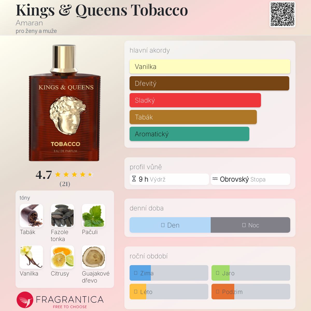 Kings & Queens Tobacco podle Amaran je Orientální Woody vůně pro ženy a muže. Kings & Queens Tobacco byl/a uveden/a v roce 2023. Vrchní tóny jsou Citrusy, Zázvor, Pelyněk a Vonokvětka; střední tóny jsouTabák, Pačuli, Guajakové dřevo a Vetiver ; základní tóny jsou Fazole tonka a Vanilka.
