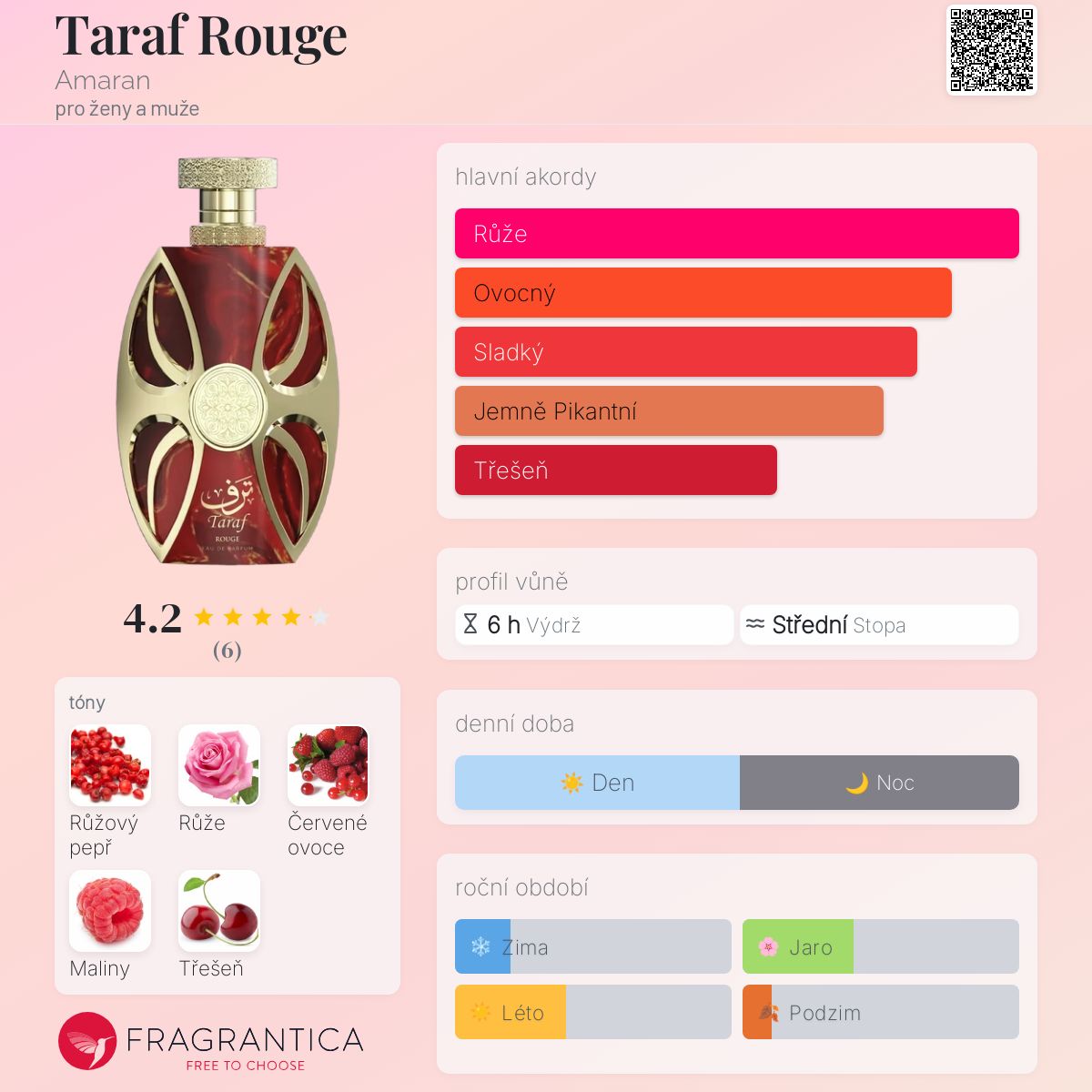 Taraf Rouge podle Amaran je Floral Fruity vůně pro ženy a muže. Toto je nová vůně. Taraf Rouge byl/a uveden/a v roce 2025. Vrchní tóny jsou Růžový pepř, Maliny a Třešeň; střední tón jeTurecká růže ; základní tón je Červené ovoce.