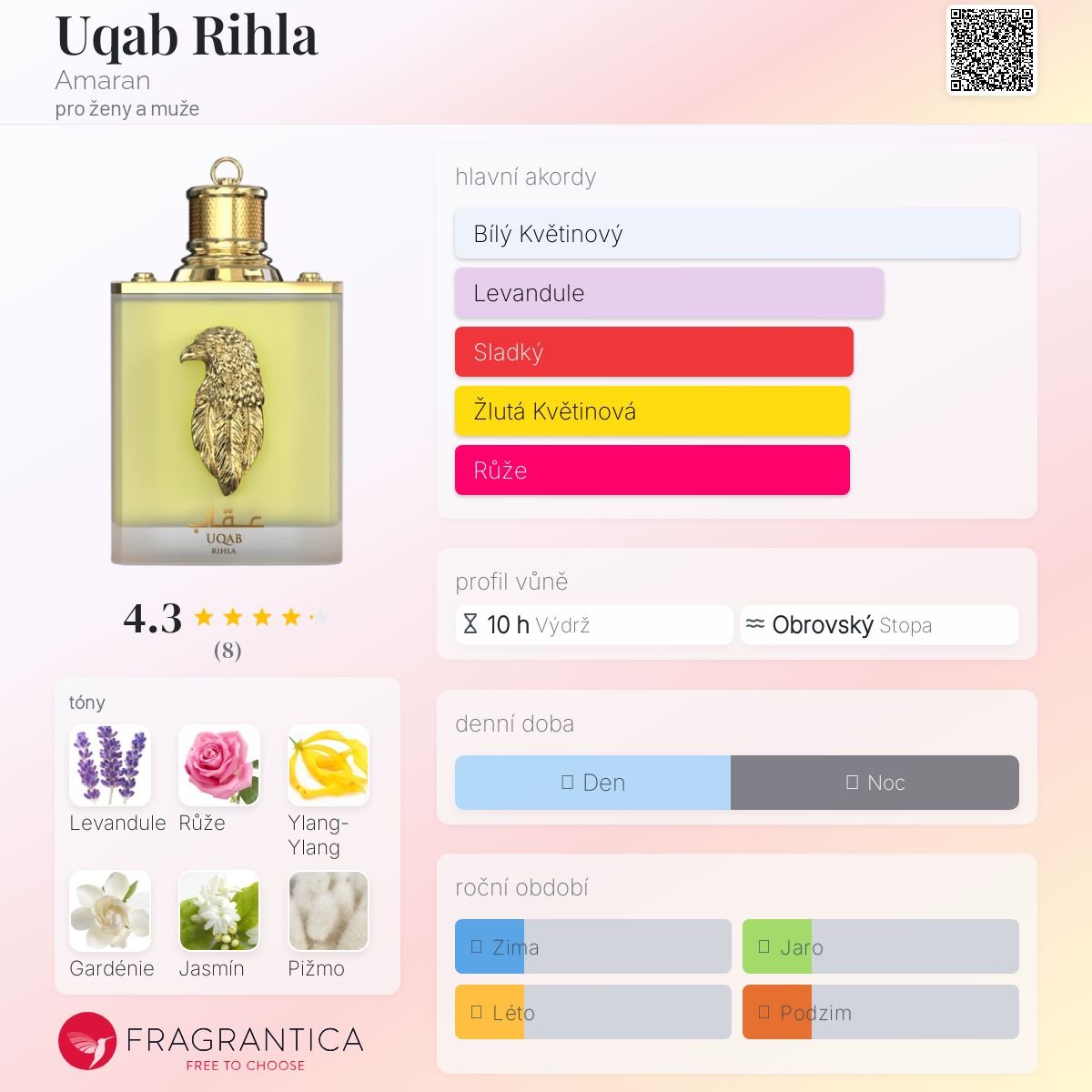 Uqab Rihla podle Amaran je Floral Fruity vůně pro ženy a muže. Toto je nová vůně. Uqab Rihla byl/a uveden/a v roce 2025. Vrchní tóny jsou Levandule, Růže a Hruška; střední tóny jsouYlang-Ylang, Gardénie a Jasmín ; základní tóny jsou Pižmo, Vanilka a Mech.