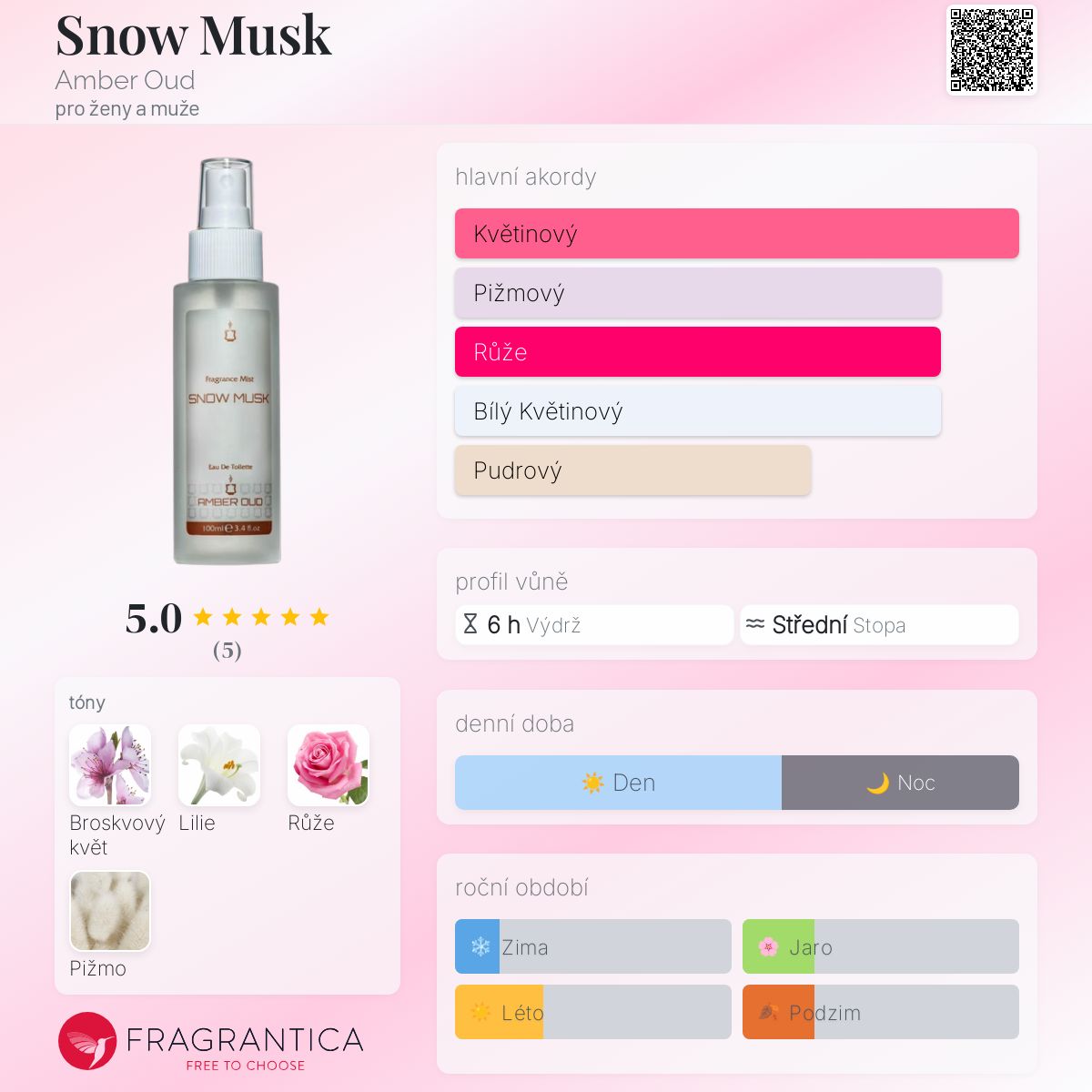 Snow Musk podle Amber Oud je Floral vůně pro ženy a muže. Snow Musk byl/a uveden/a v roce 2018. "Nosem" za touto vůní je Saud Malallah. Vrchní tón je Broskvový květ ; střední tóny jsouLilie a Růže ; základní tón je Bílé pižmo.