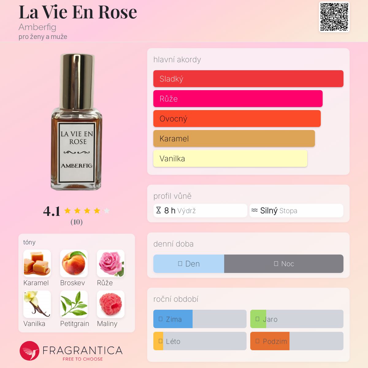 La Vie En Rose podle Amberfig je Orientální Floral vůně pro ženy a muže. La Vie En Rose byl/a uveden/a v roce 2016. "Nosem" za touto vůní je David Magalhães. Vrchní tóny jsou Broskev, Petitgrain a Maliny; střední tóny jsouRůže, Kokos, Kosatec, Jasmín, Neroli, Pelargónie a Lilie ; základní tóny jsou Karamel, Vanilka a Bílé pižmo.