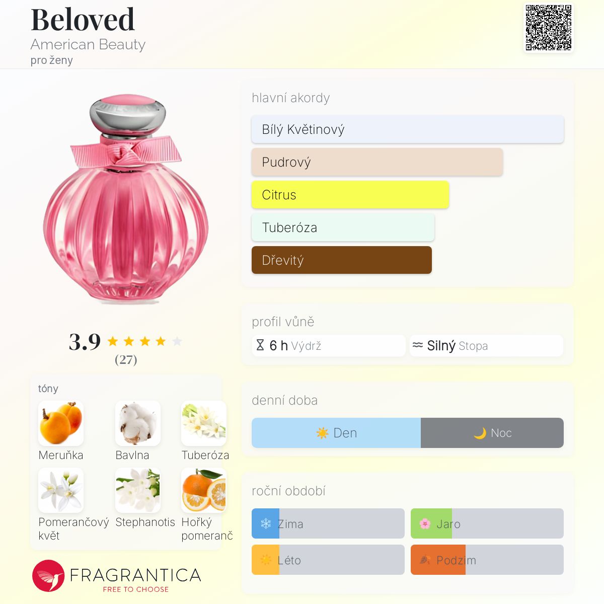 Beloved podle American Beauty je Floral vůně pro ženy. Beloved byl/a uveden/a v roce 2008. "Nosem" za touto vůní je Karyn Khoury. Vrchní tóny jsou Meruňka, Hořký pomeranč a Arum lilie; střední tóny jsouTuberóza, Květ afrického pomeranče, Stephanotis a Kosatec ; základní tóny jsou Bavlna, Santalové dřevo a Jantar (ambra).