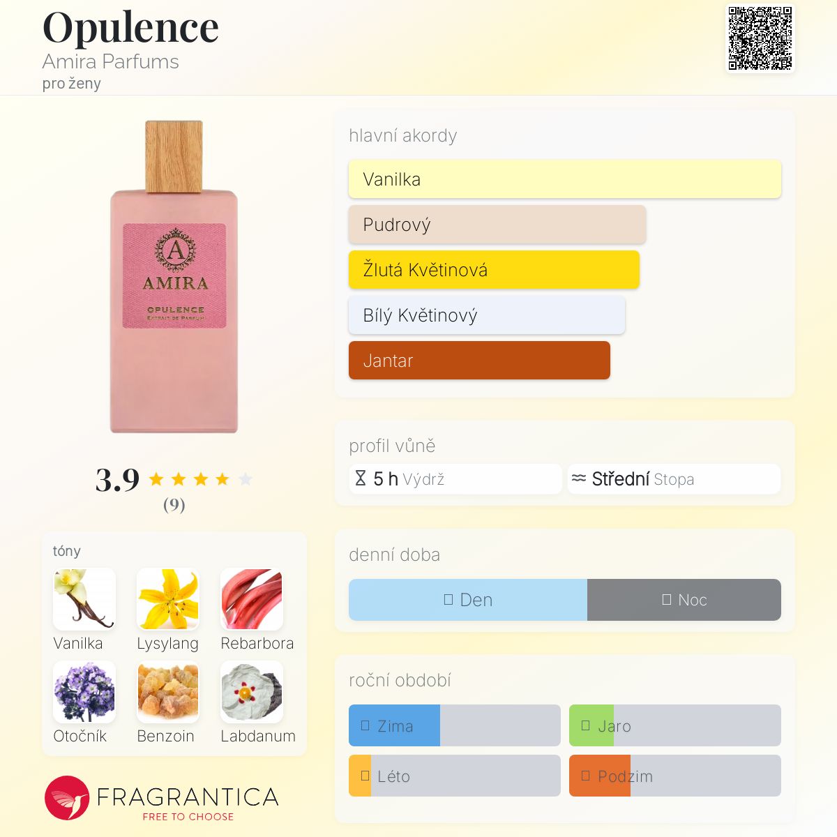Opulence podle Amira Parfums je Orientální Floral vůně pro ženy. Opulence byl/a uveden/a v roce 2022. Vrchní tóny jsou Lysylang a Rebarbora; střední tóny jsouOtočník a Labdanum ; základní tóny jsou Vanilka, Benzoin a Agarové dřevo (oud).