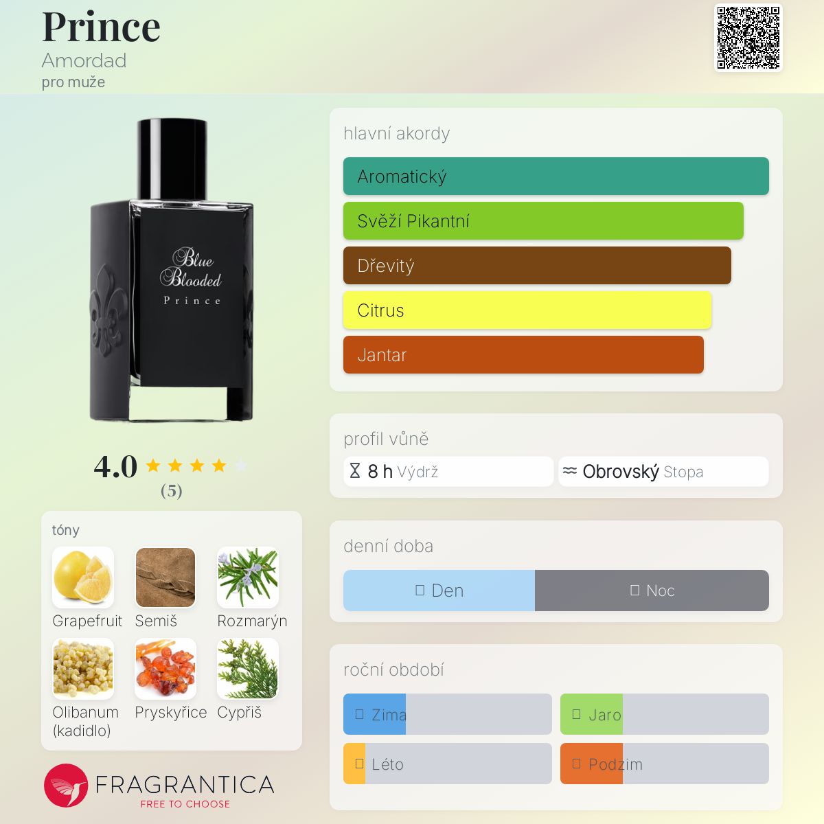 Prince podle Amordad je Aromatic Fougere vůně pro muže. Prince byl/a uveden/a v roce 2011. Vrchní tóny jsou Grapefruit, Rozmarýn, Cypřiš a Kardamom; střední tóny jsouOlibanum, Pryskyřice, Tuberóza a Ylang-Ylang ; základní tóny jsou Semiš, Vetiver a Cedr.