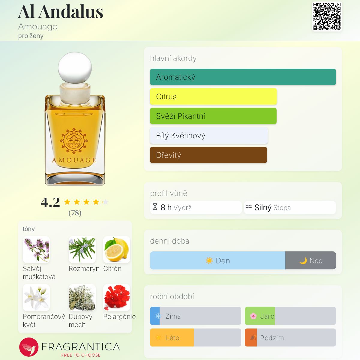 Al Andalus podle Amouage je Chypre Floral vůně pro ženy. Vrchní tóny jsou Rozmarýn, Citron amalfi a Květ afrického pomeranče; střední tóny jsouŠalvěj muškátová, Pelargónie a Konvalinka ; základní tóny jsou Dubový mech, Santalové dřevo a Pižmo.