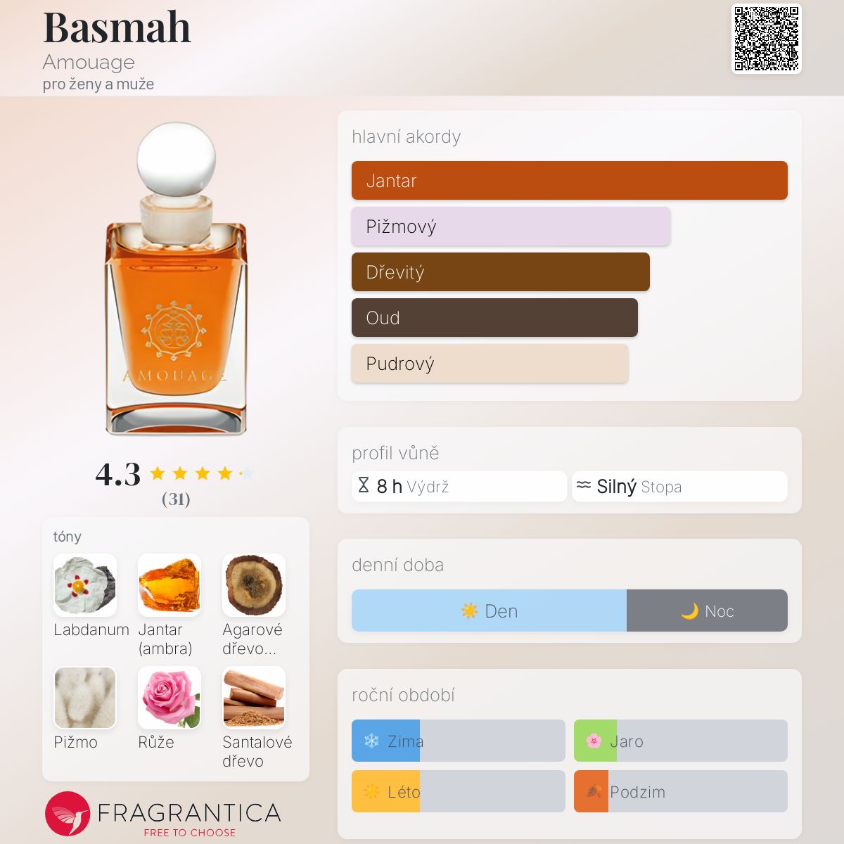 Basmah podle Amouage je Orientální vůně pro ženy a muže. Vrchní tóny jsou Francouzské labdanum a Jantar (ambra); střední tóny jsouPižmo a Růže ; základní tóny jsou Agarové dřevo (oud) a Santalové dřevo.